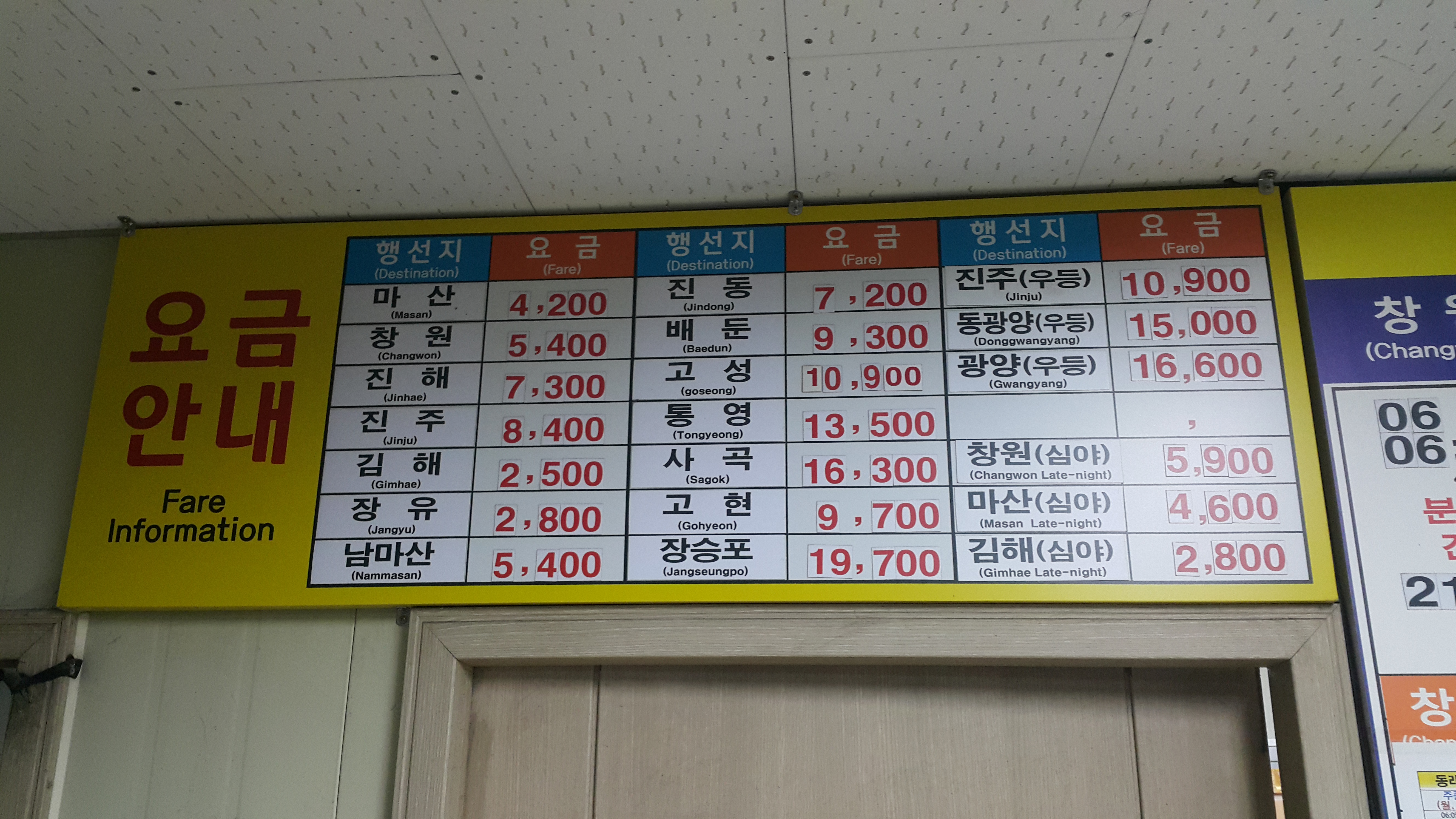동래시외버스정류소 요금표