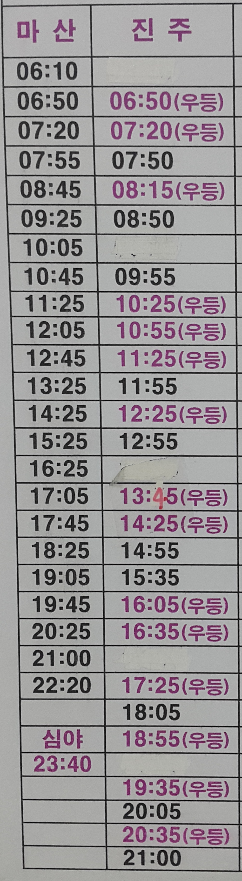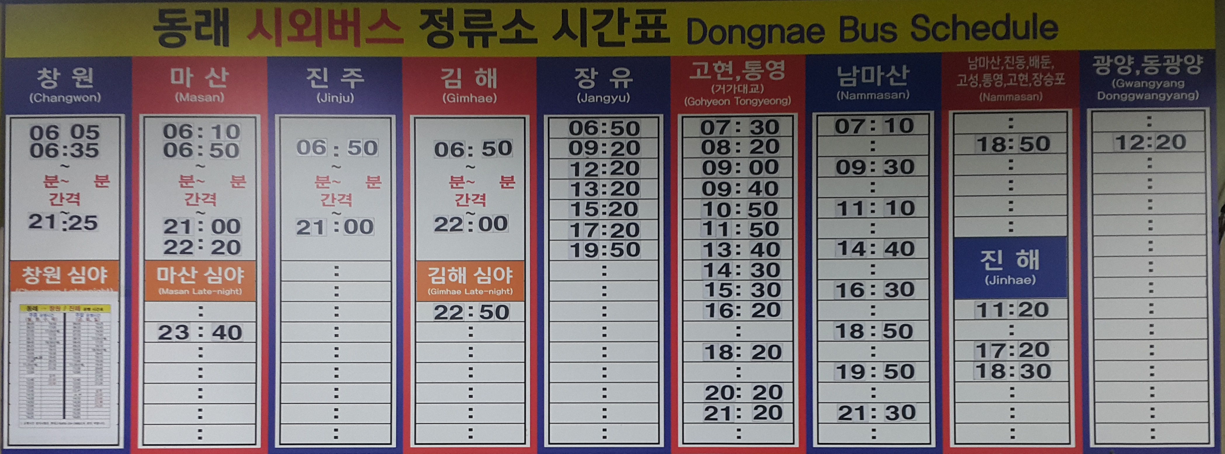동래 출발 창원, 진해 주중, 주말 운행 시간표.