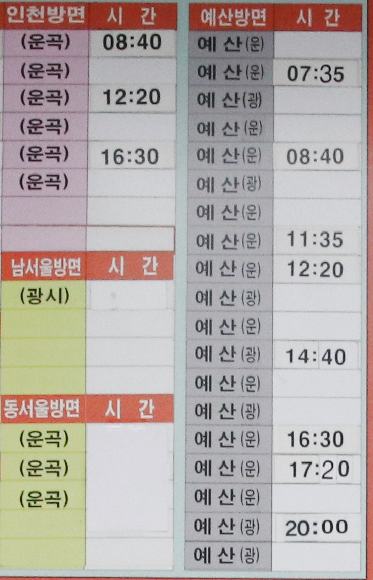 청양 출발 인천, 남서울, 동서울, 예산 방면.