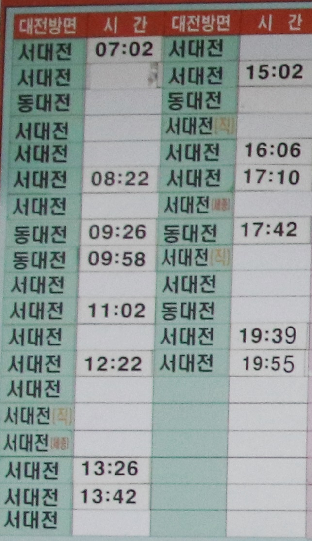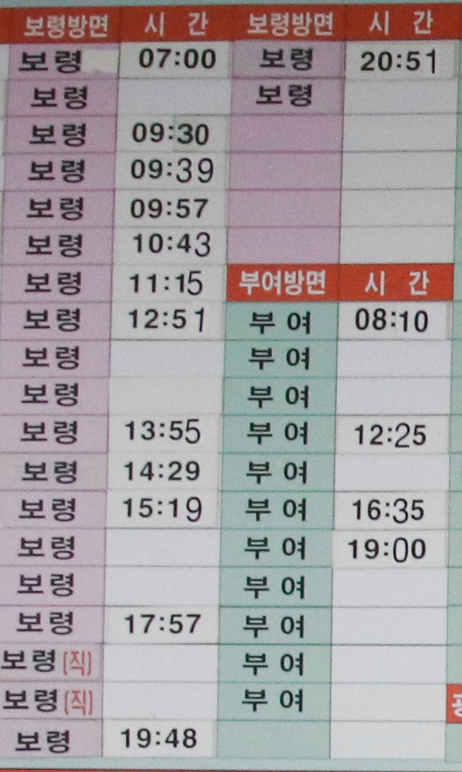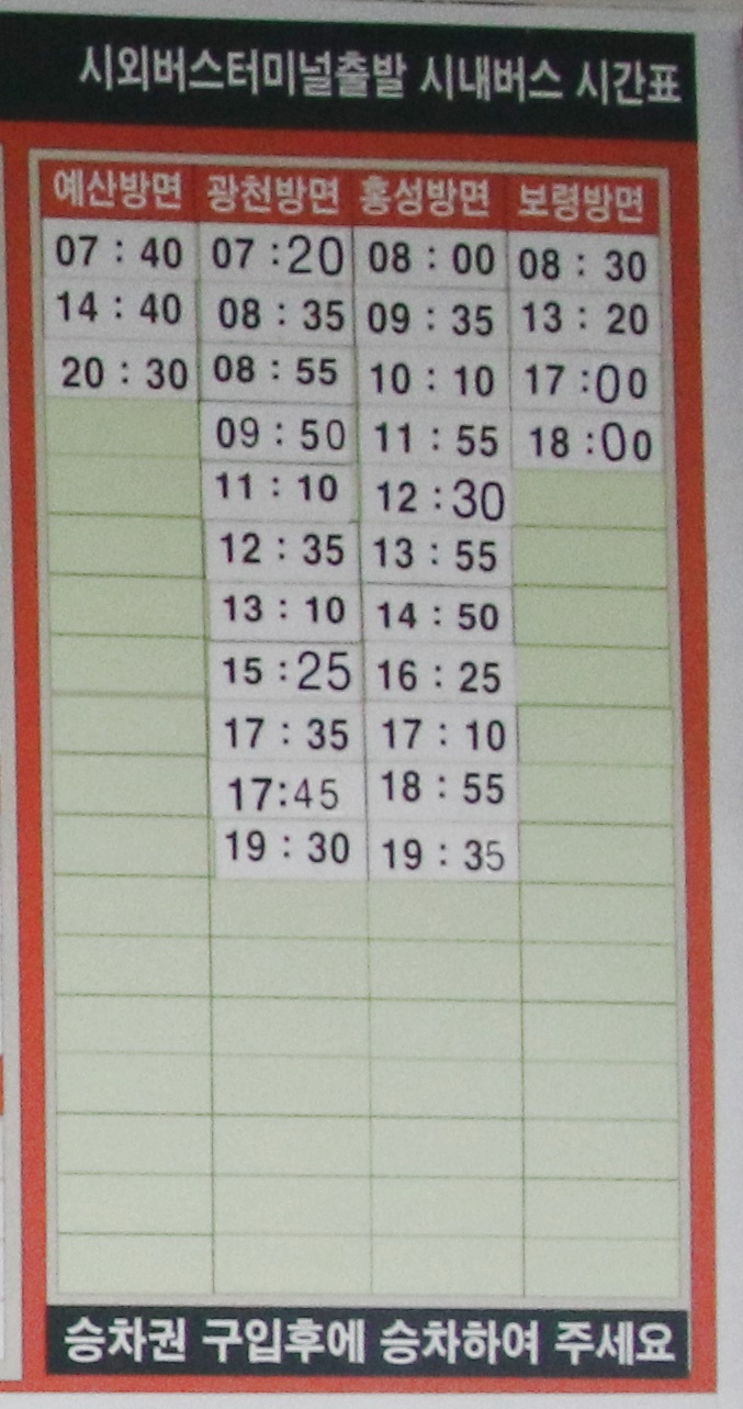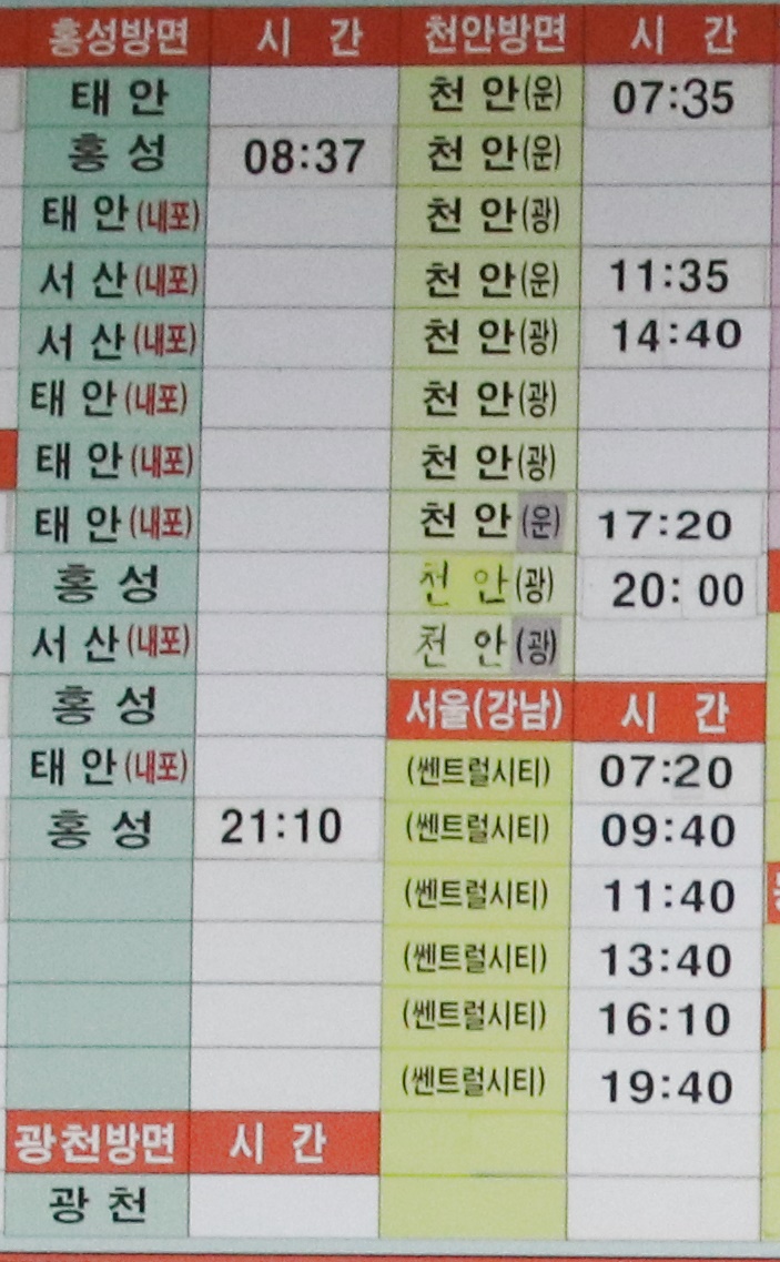 청양 출발 홍성, 광천, 천안, 서울(강남) 방면.