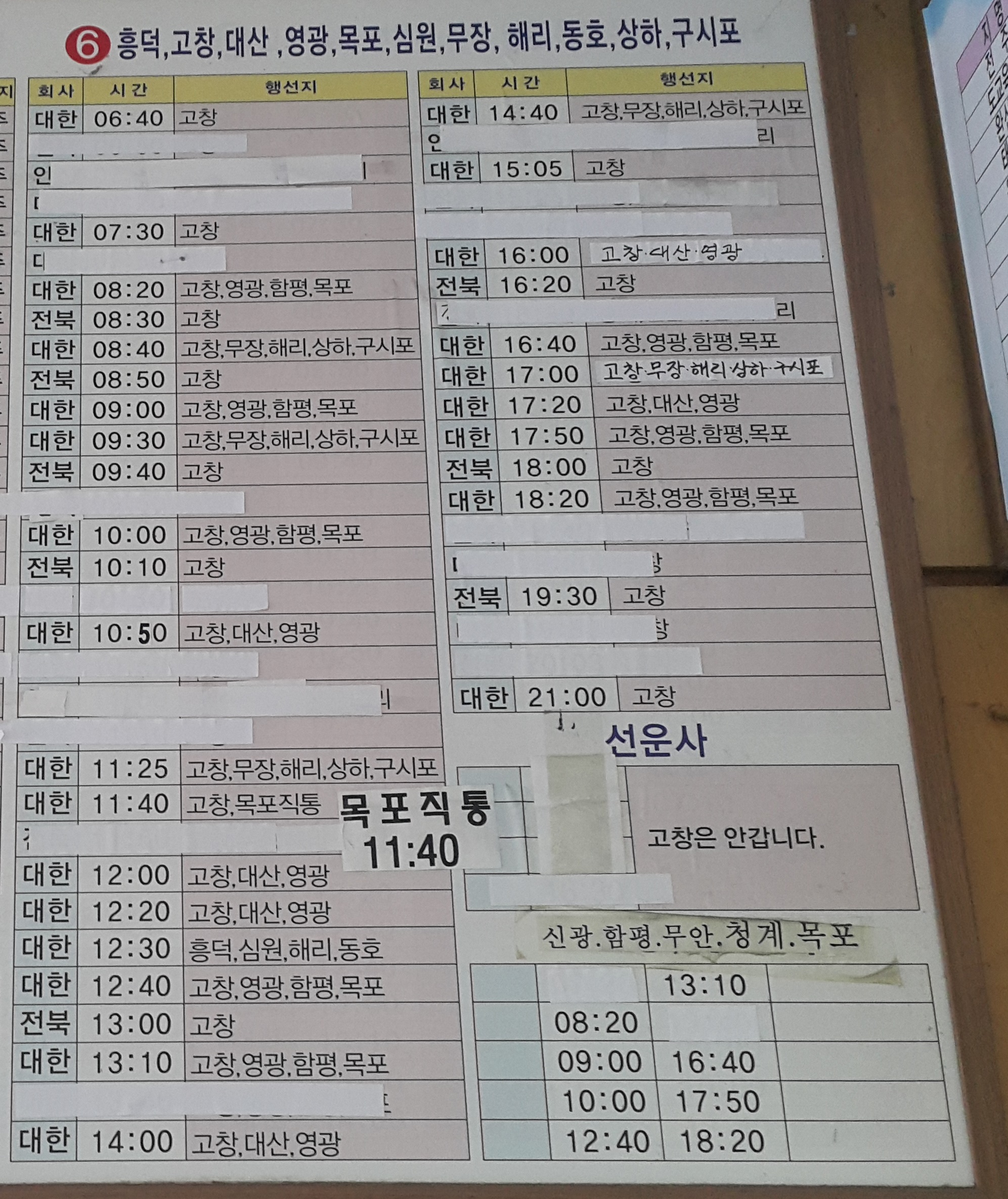 정읍 출발 흥덕 고창, 대산, 영광, 목포, 심원, 무장, 해리, 동호, 상하, 구시포, 신광, 함평, 무안, 청계, 목포 방면.