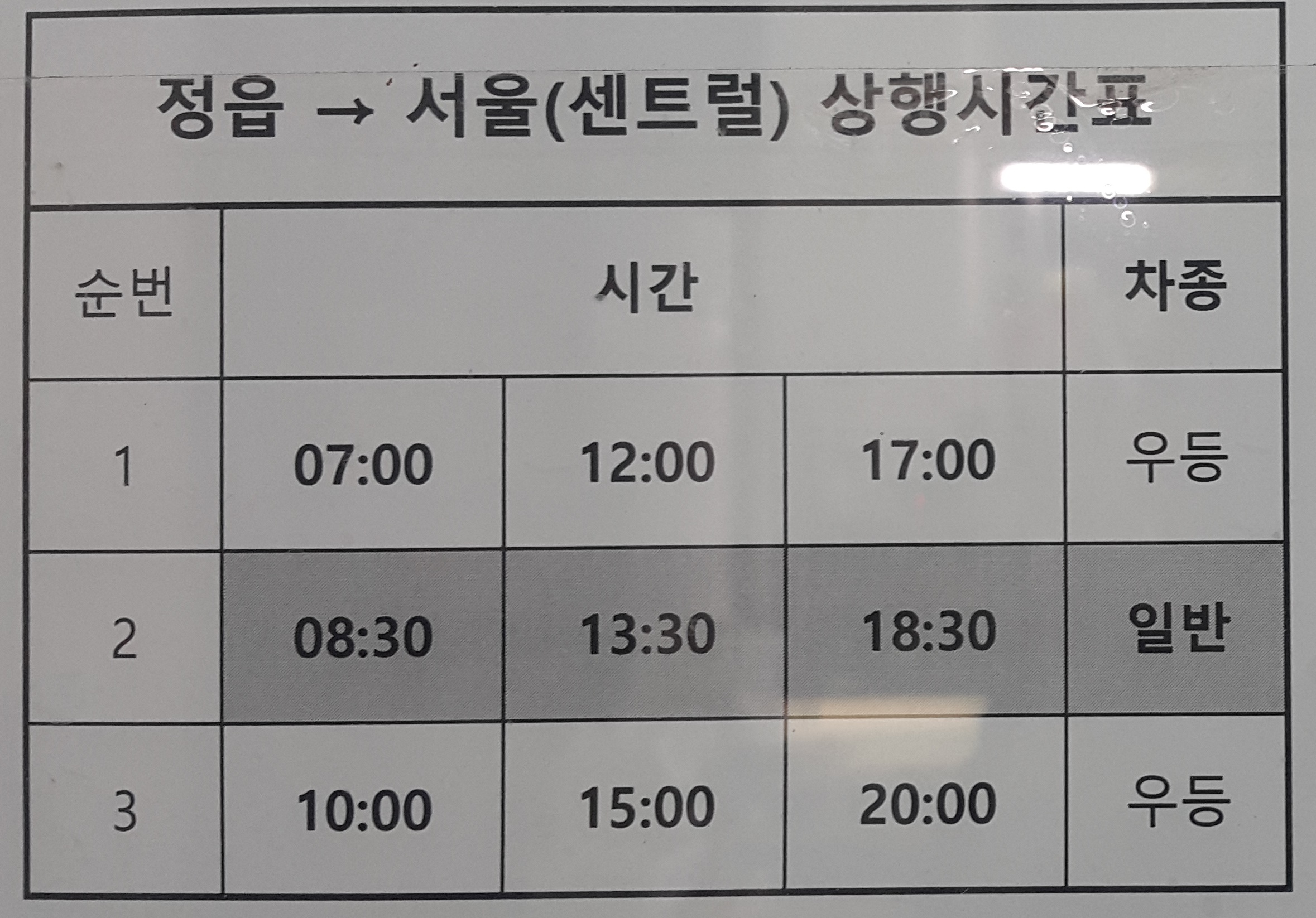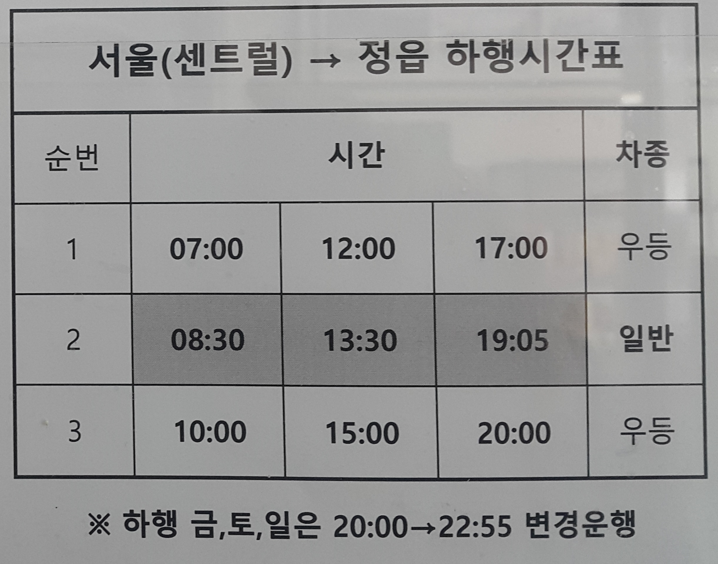 정읍 출발 서울(센트럴)상행 시간표