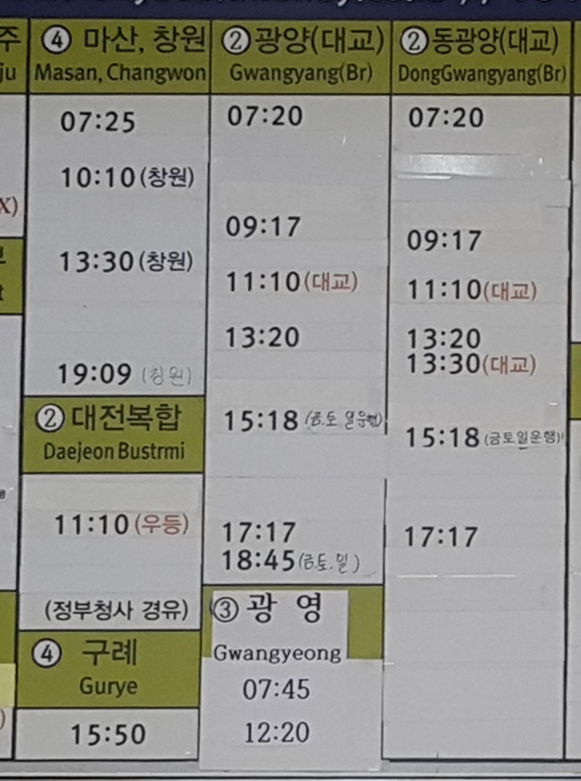 여수 출발 마산, 창원, 대전 복합, 구례, 광양, 광영, 동광양 방면.