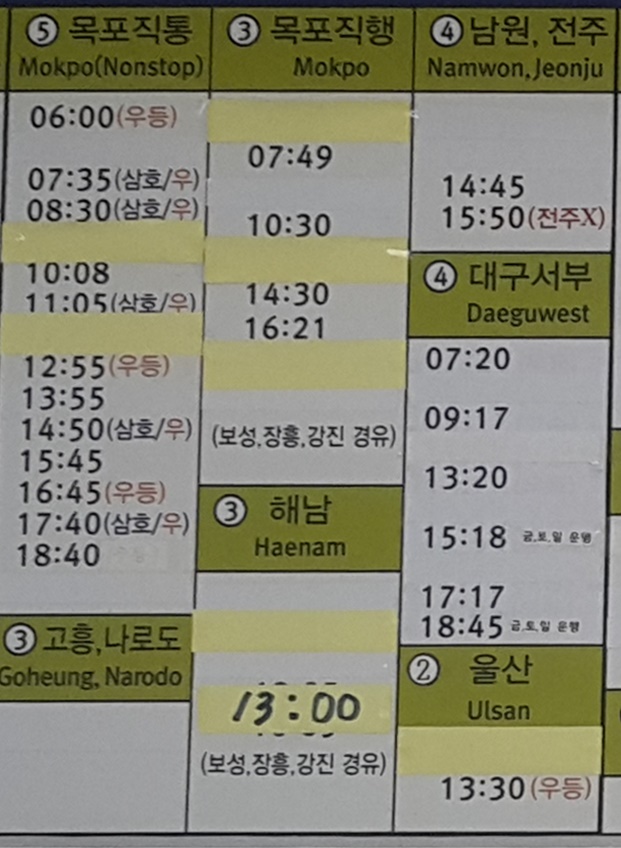 여수 출발 목포, 고흥, 나로도, 해남, 보성, 장흥, 강진, 남원, 전주, 대구 서부, 울산 방면.