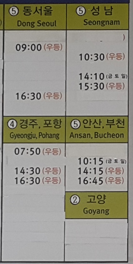여수 출발 동서울, 경주, 포항, 성남, 안산, 부천, 고양 방면.