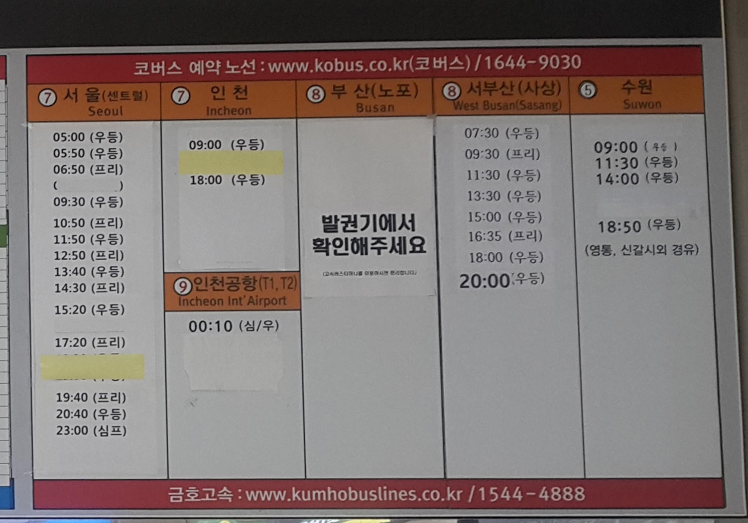 여수 출발 서울 센트럴, 인천, 인천공항, 부산 노포, 서부산 사상, 수원 방면.