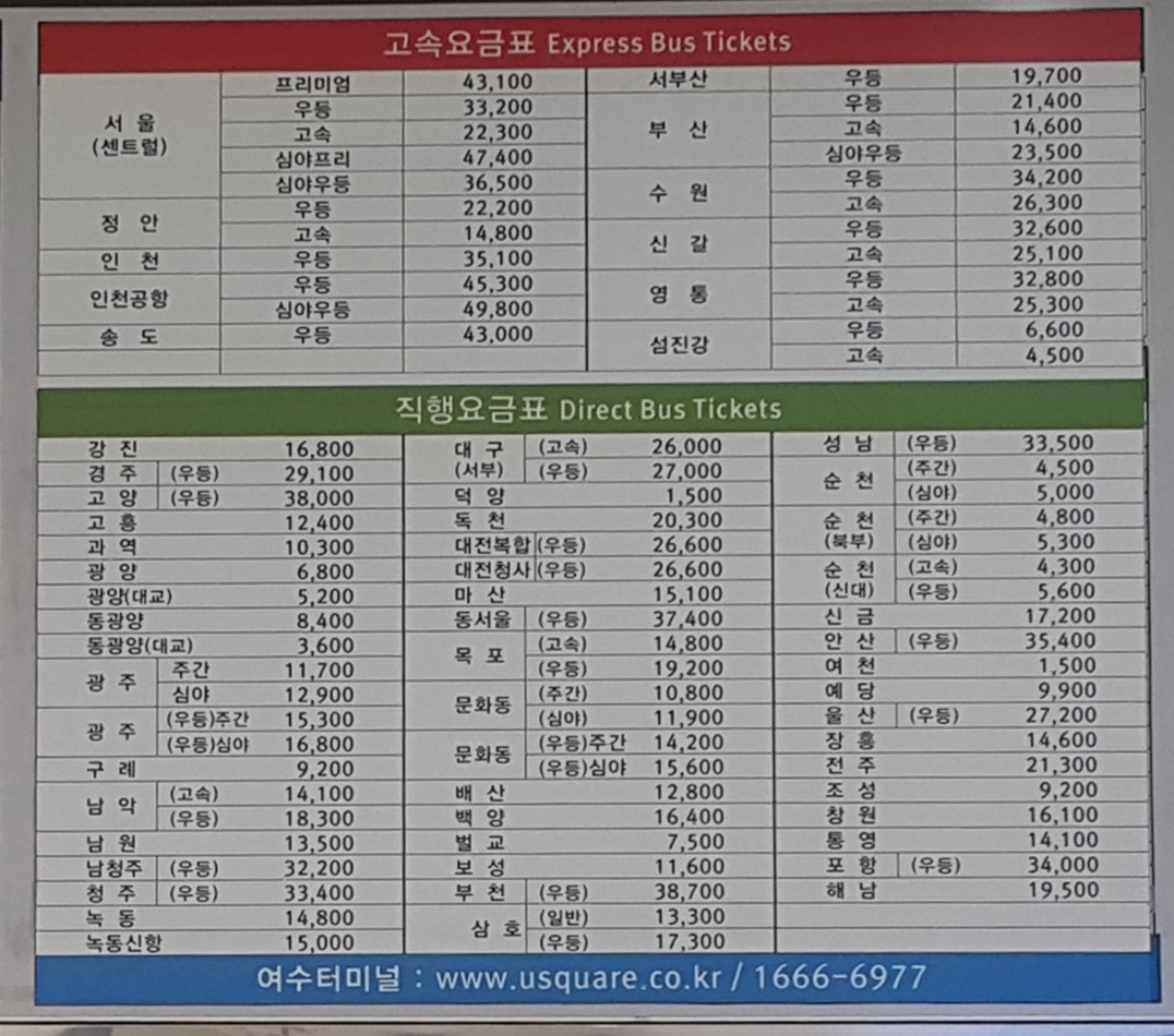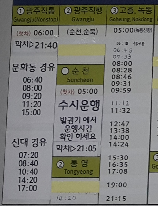 여수 출발 광주, 고흥, 녹동, 순천, 통영 방면.