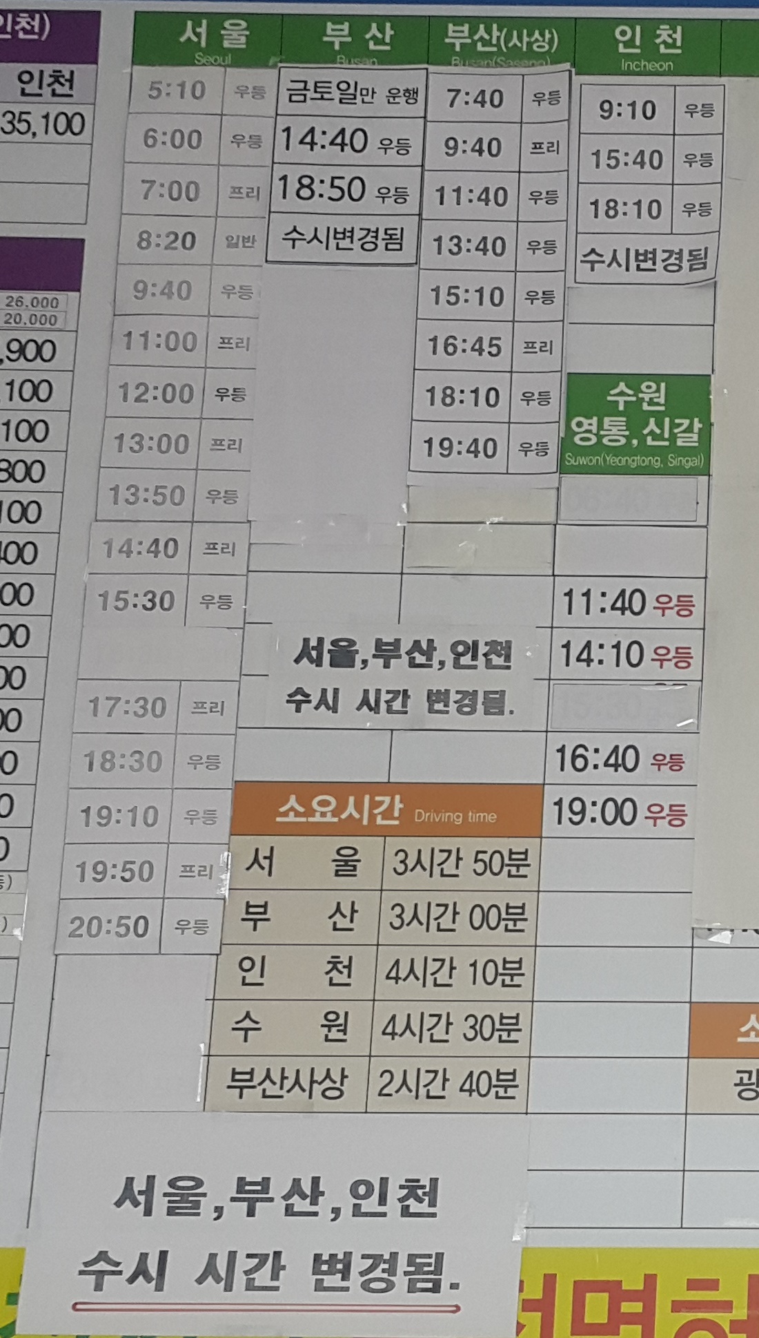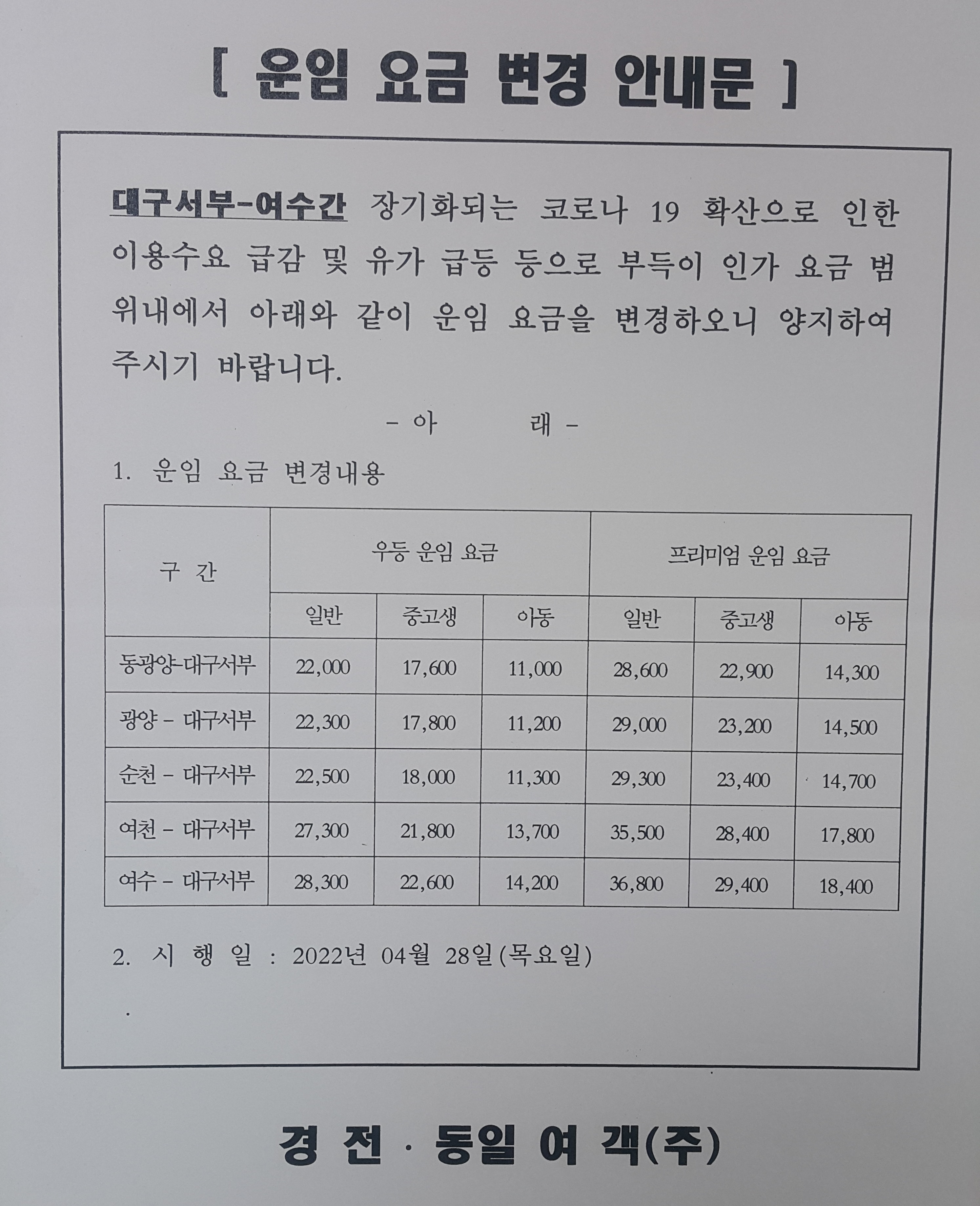 여천 출발 광주 출발 시간 변경 안내