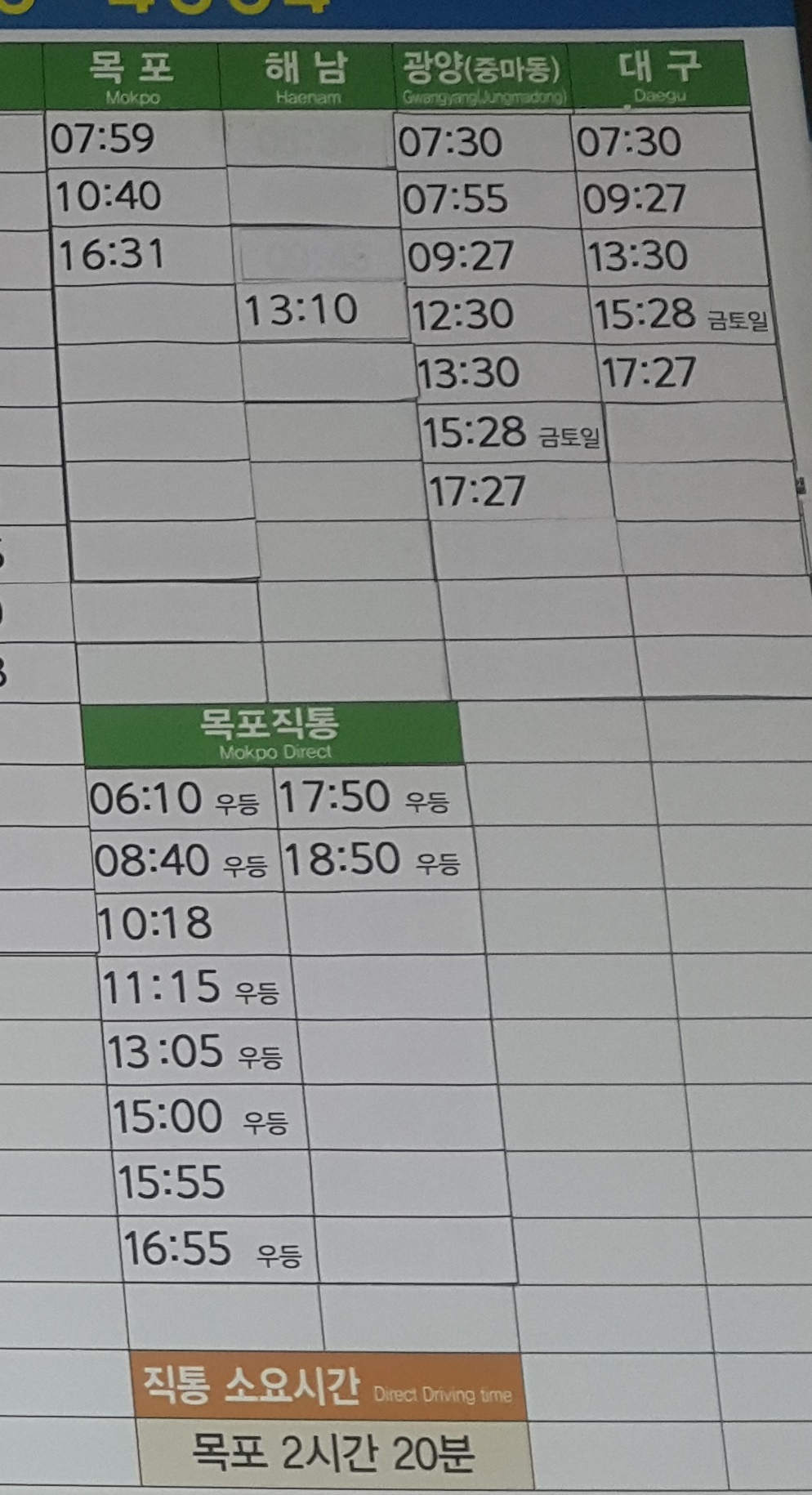 여천 출발 목포, 해남, 광양 중마동, 대구 방면.