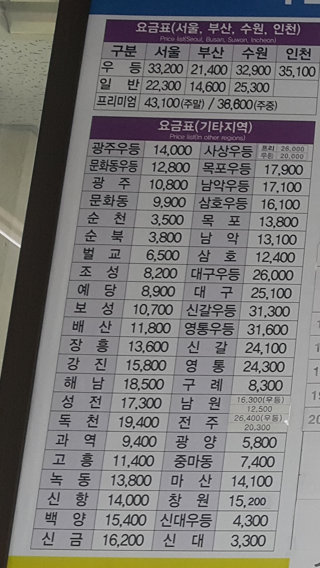 여천시외버스정류소 요금표