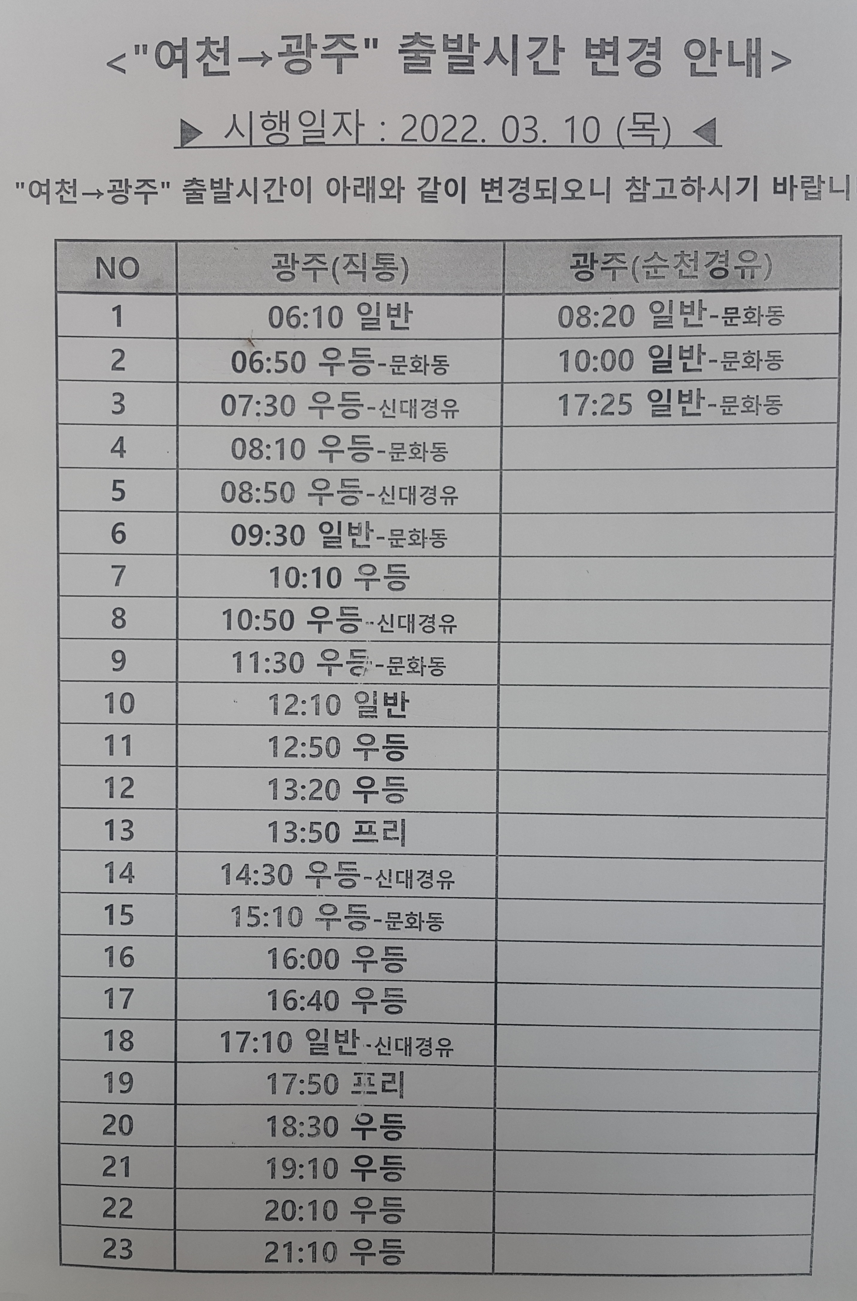 여천 출발 광주 출발 시간 변경 안내