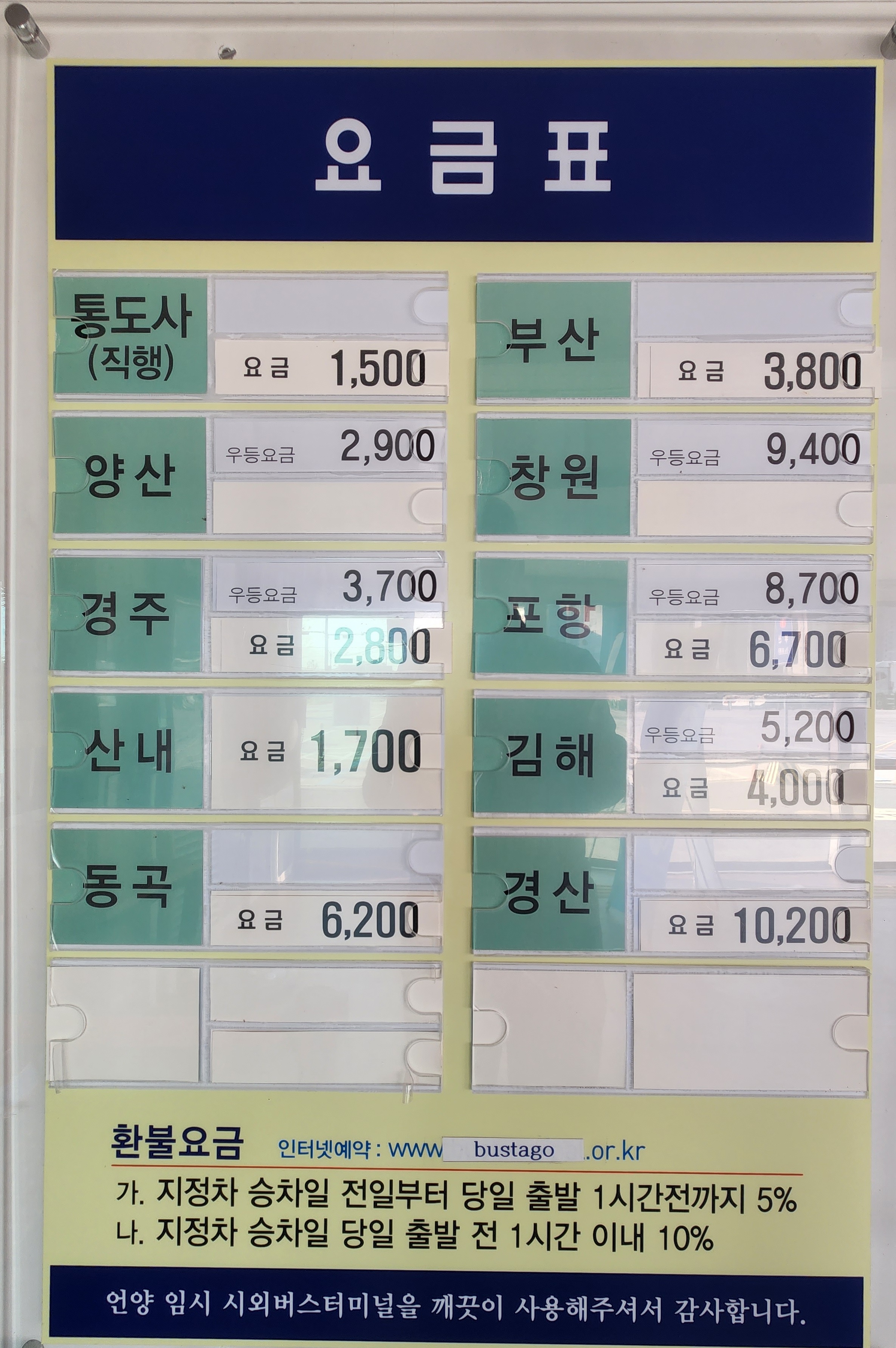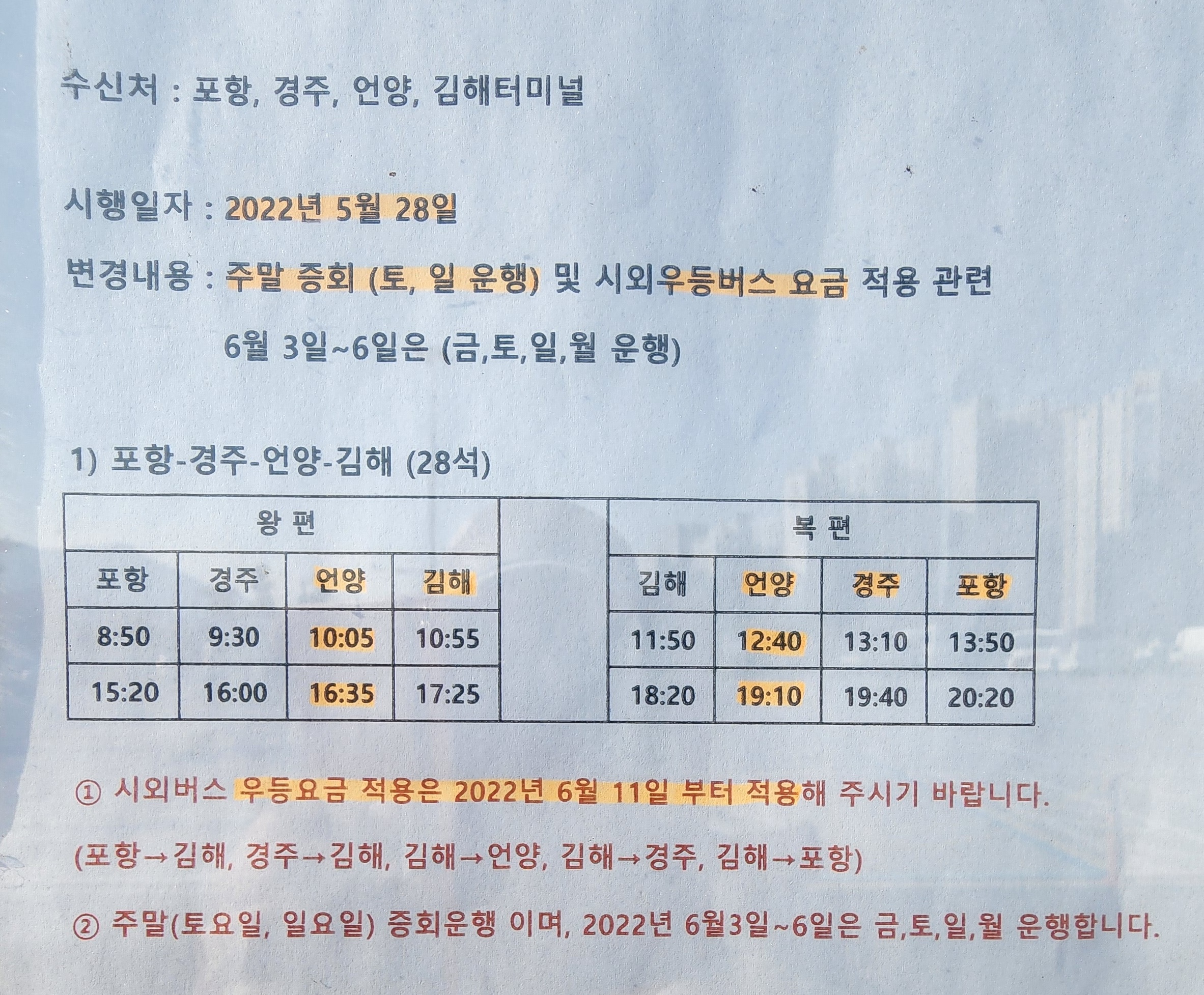 포항, 경주, 언양, 김해 주말 증회 및 시외우등버스 요금 적용.