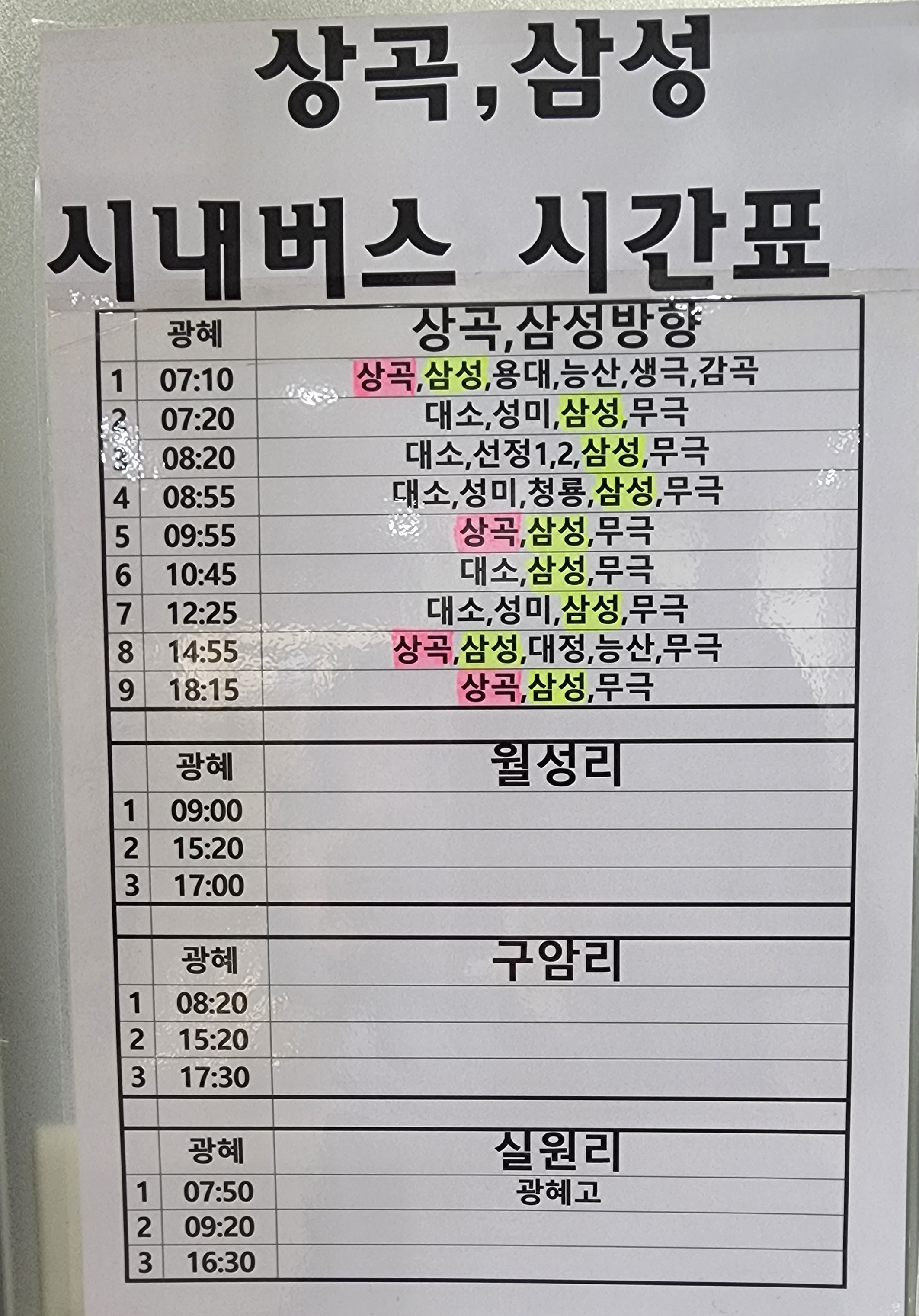 광혜원시외버스터미널 출발 상곡, 삼성 시내버스 시간표.