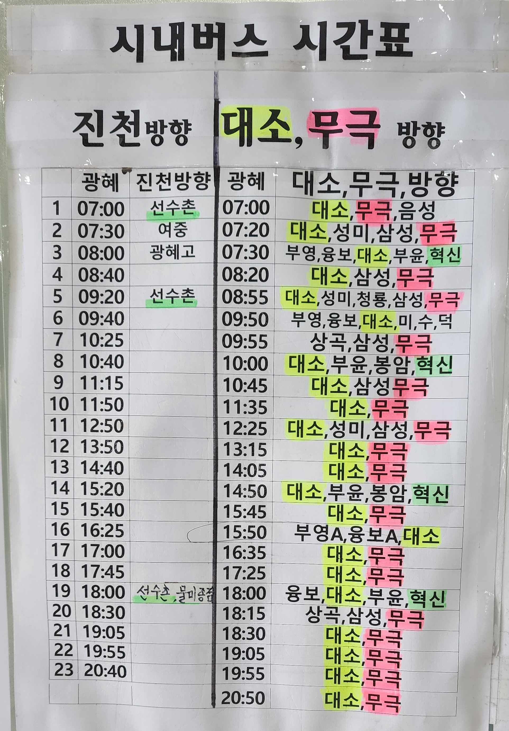 광혜원 시내버스 시간표 진천, 대소, 무극 방향,