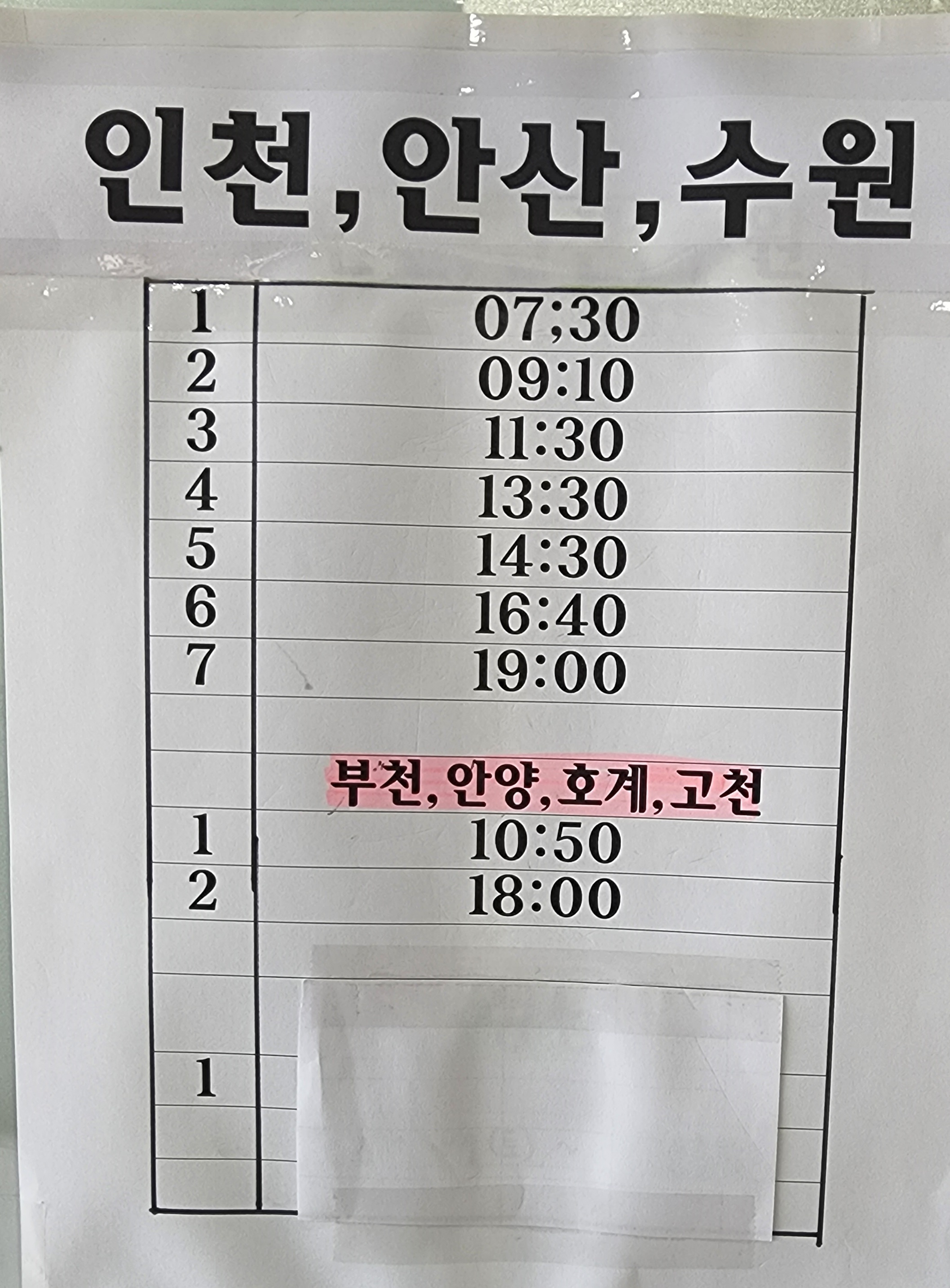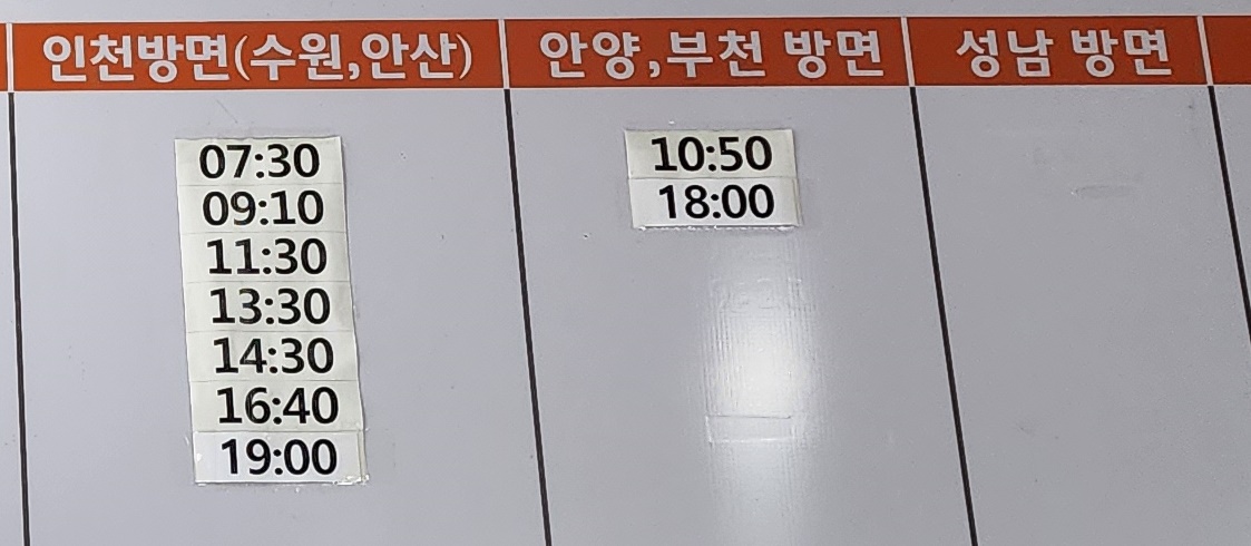 광혜원 출발 인천, 수원, 안산, 안양, 부천 방면.