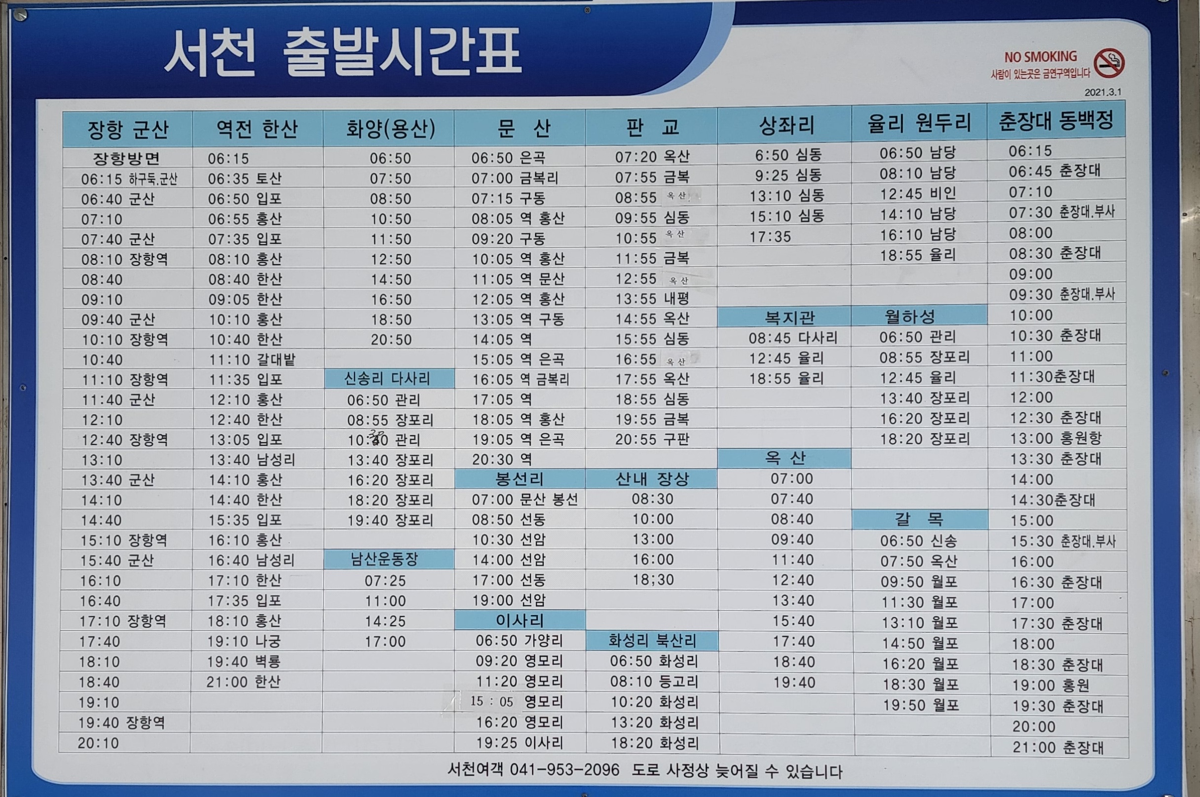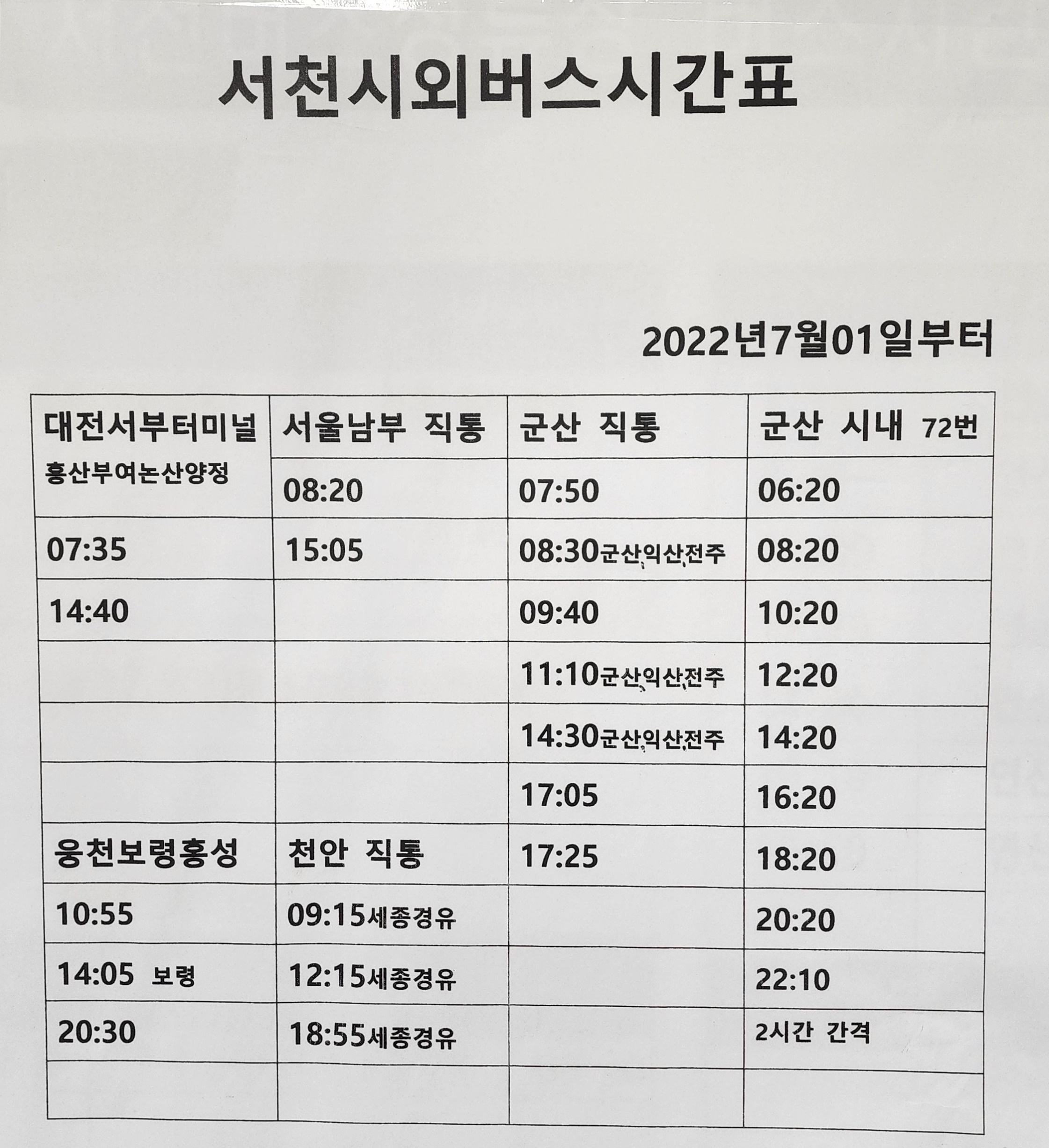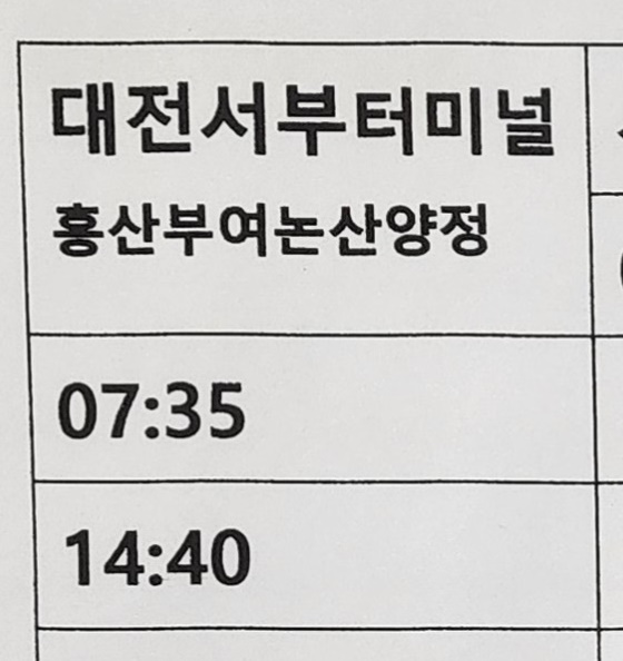 서천 출발 대전서부터미널, 흥산, 부여, 논산 양정 방면.