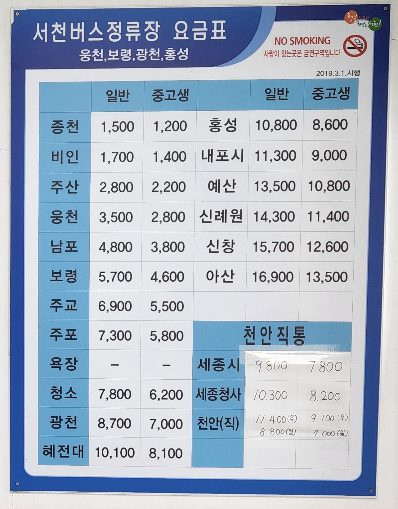 서천버스정류장 요금표