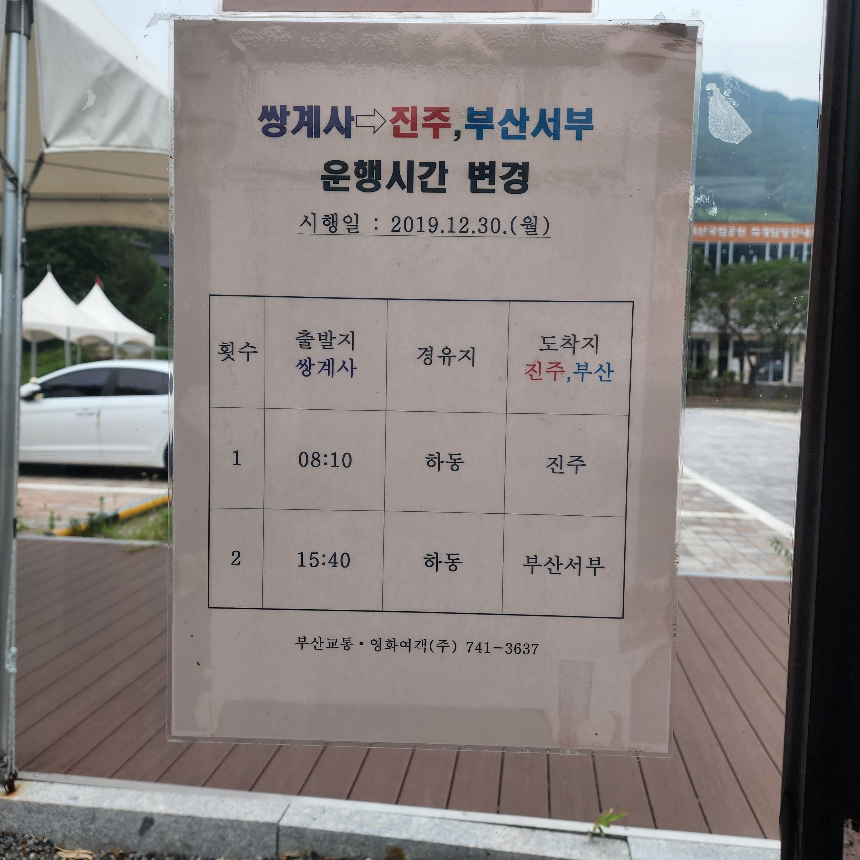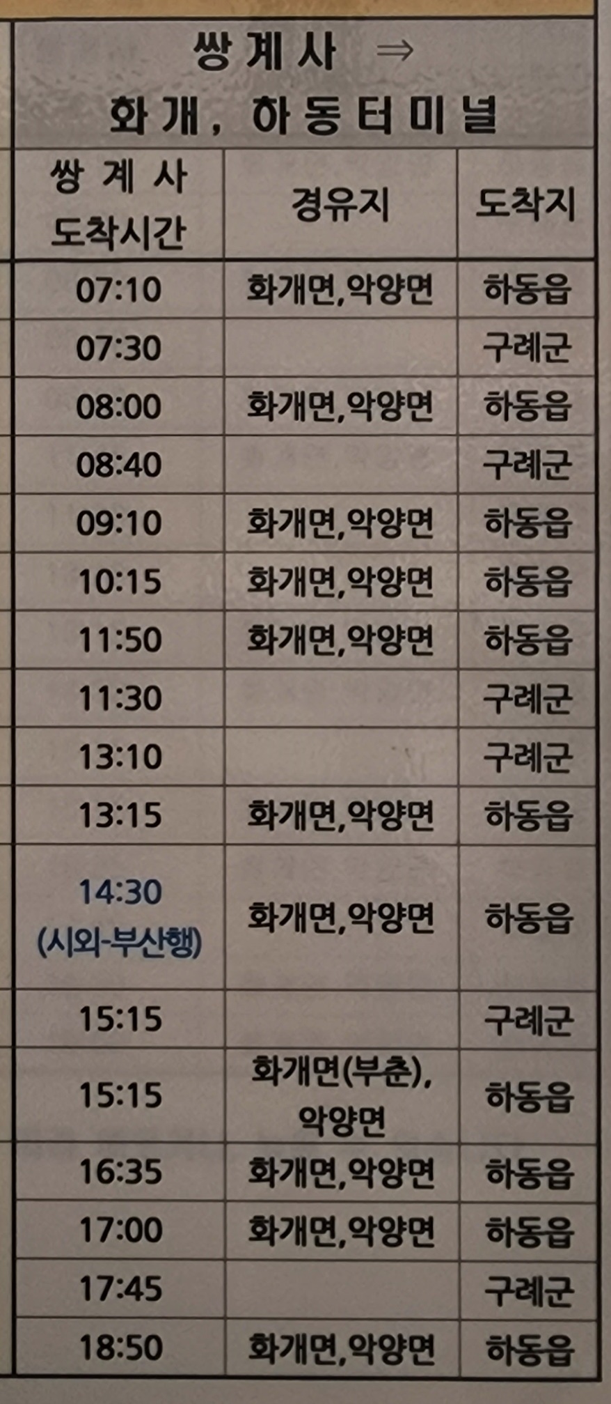 쌍계사 출발 구례, 화개, 악양, 하동시외버스터미널 방면.