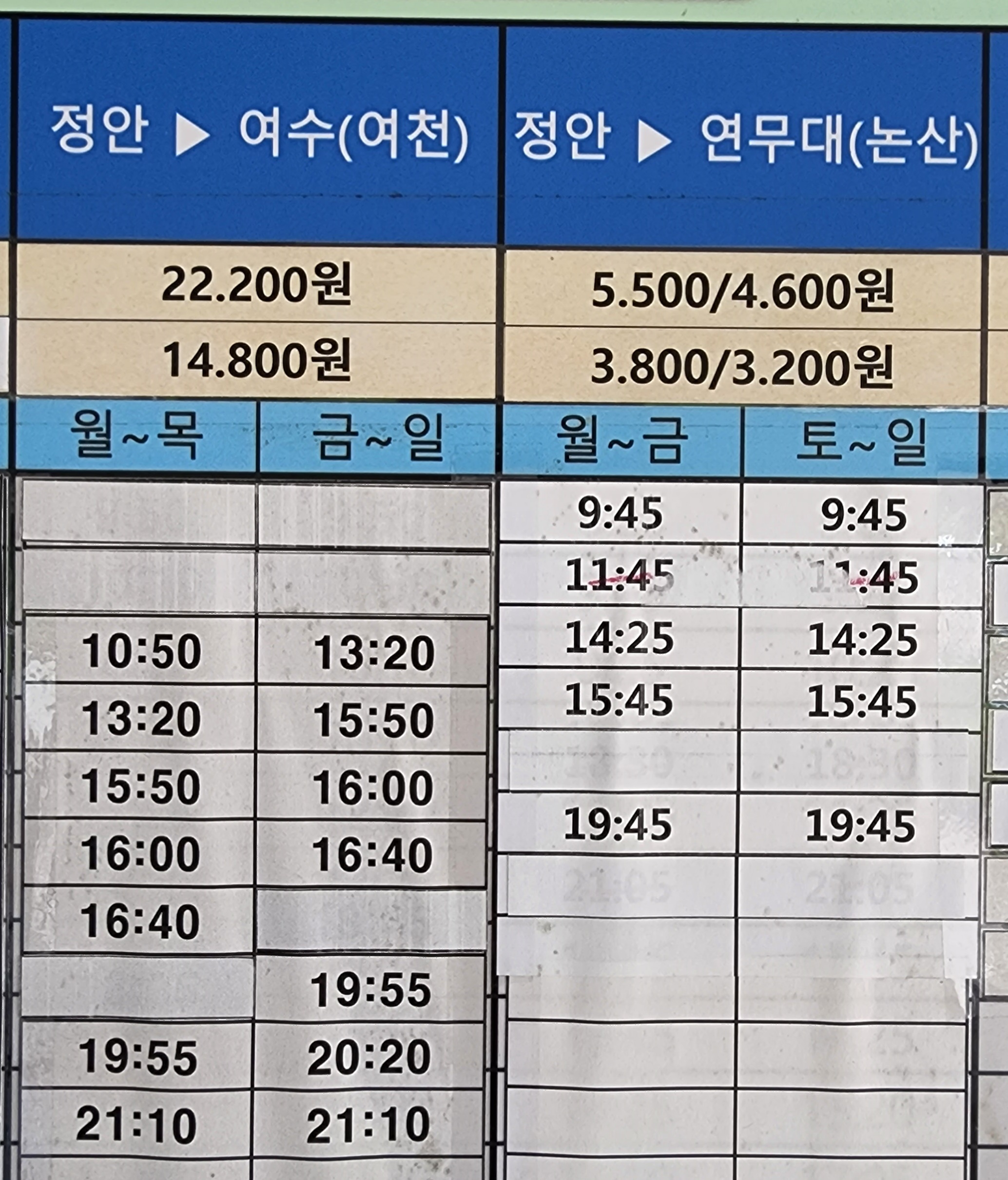 정안 출발 여수, 여천, 연무대 논산 방면.