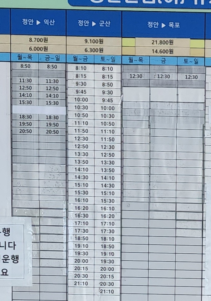 정안 출발 익산, 군산, 목포 방면.