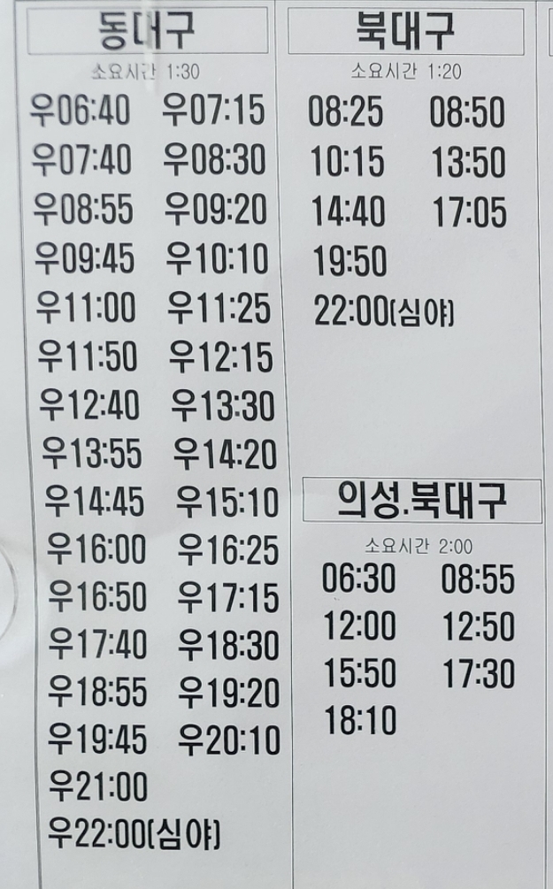 안동 출발 동대구, 북대구, 의성 방면