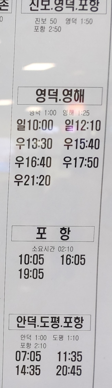 안동 출발 진보, 영덕, 영해, 안덕, 도평, 포항. 방면