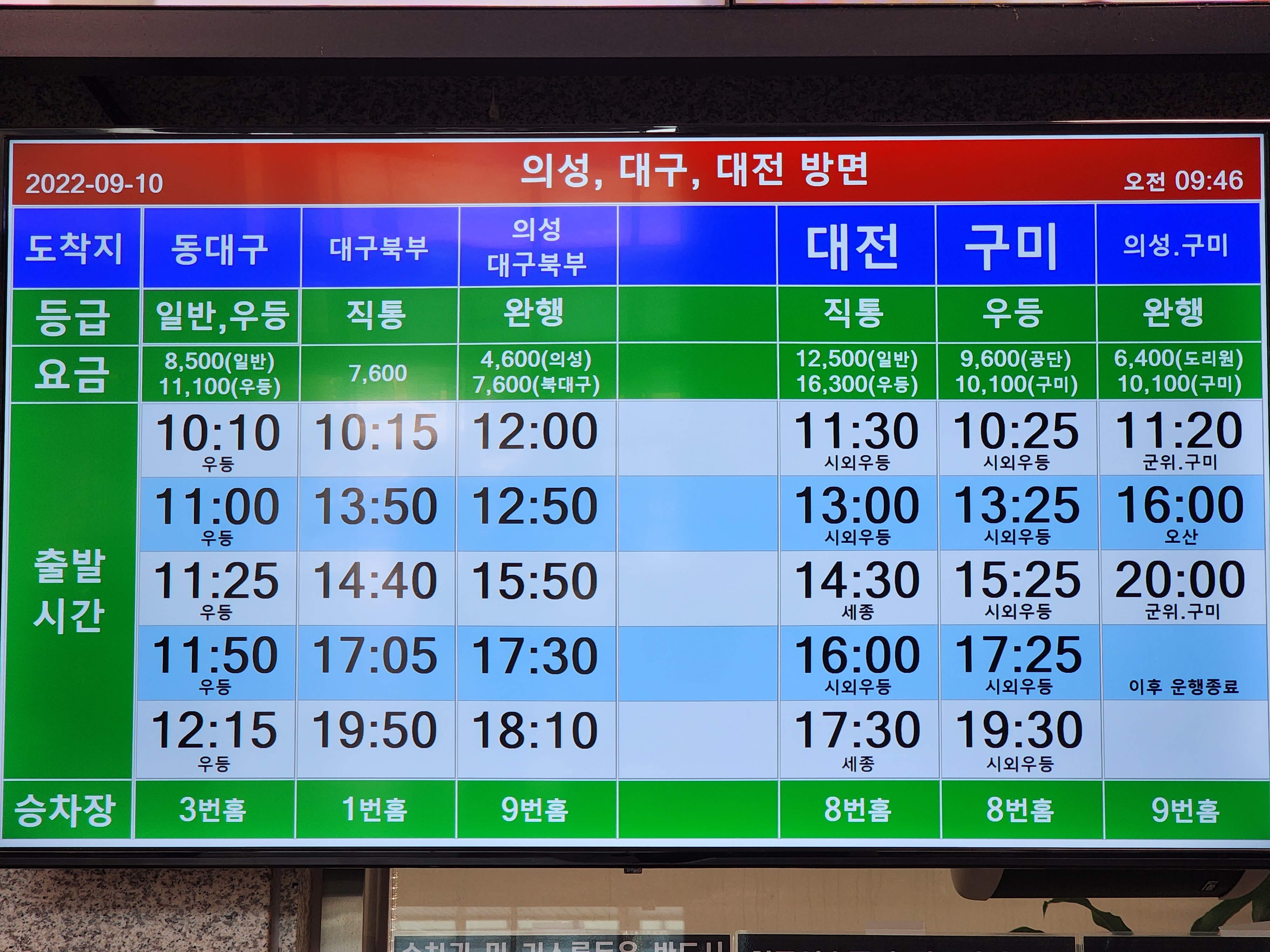 안동 출발의성, 대구, 대전 방면