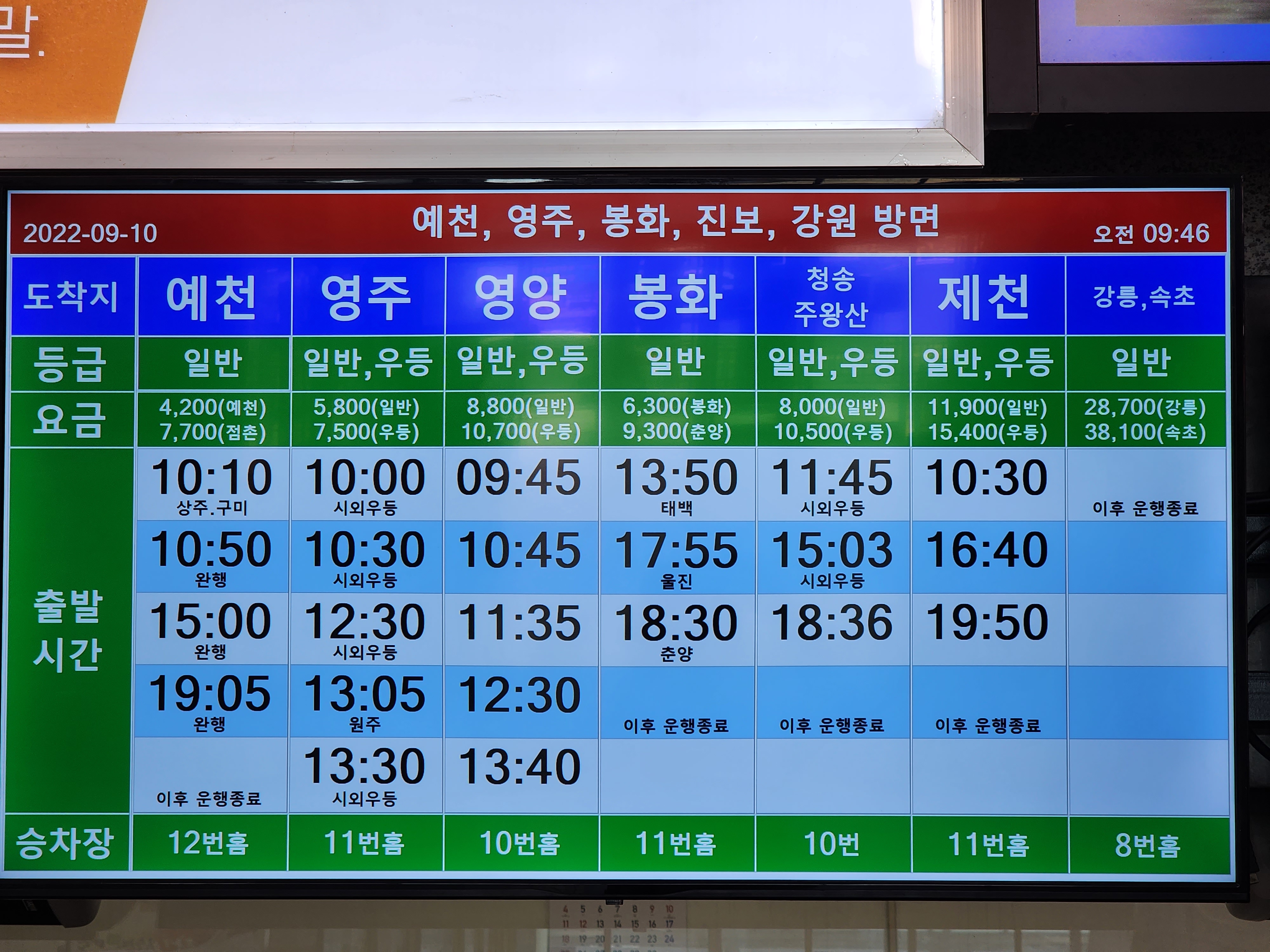 안동시외버스터미널 요금표