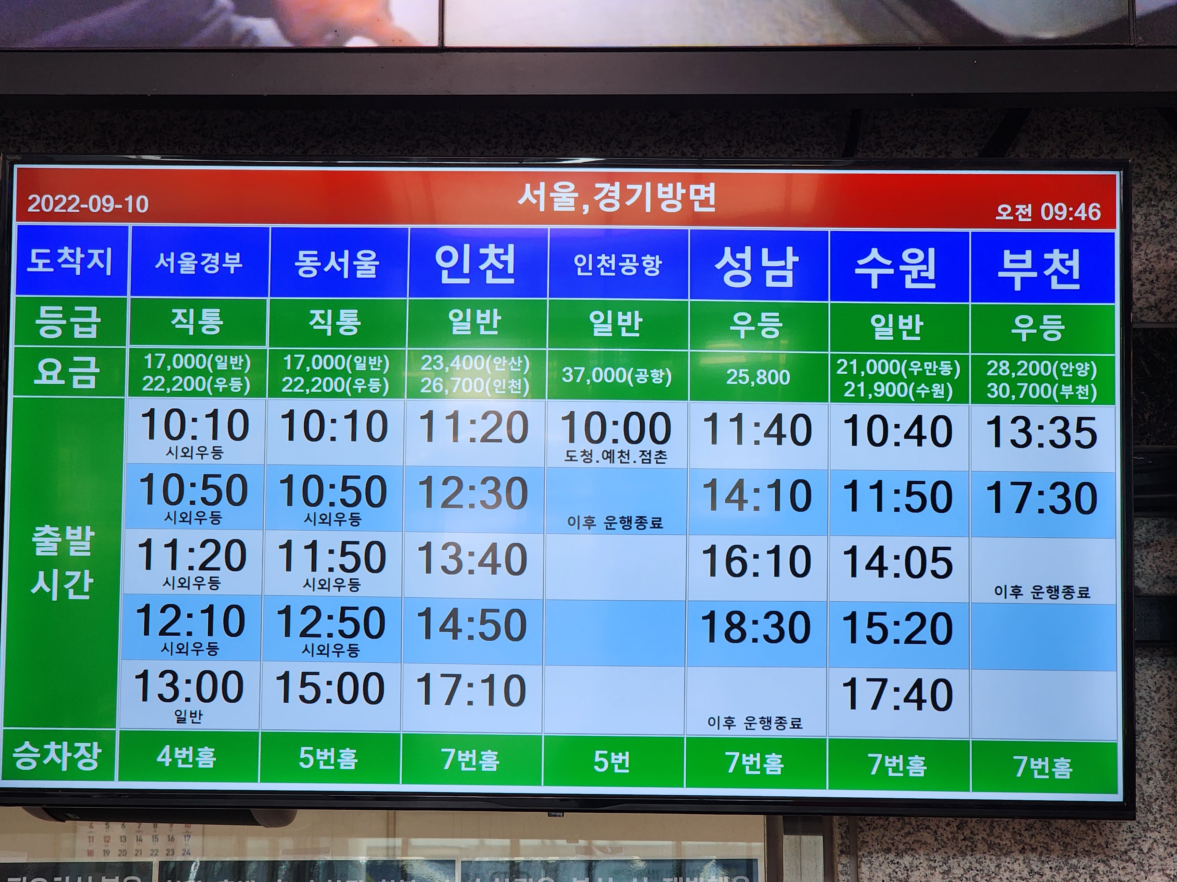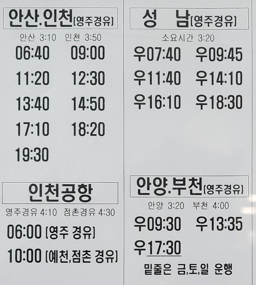 안동 출발. 수원, 의정부, 고양, 오산 방면