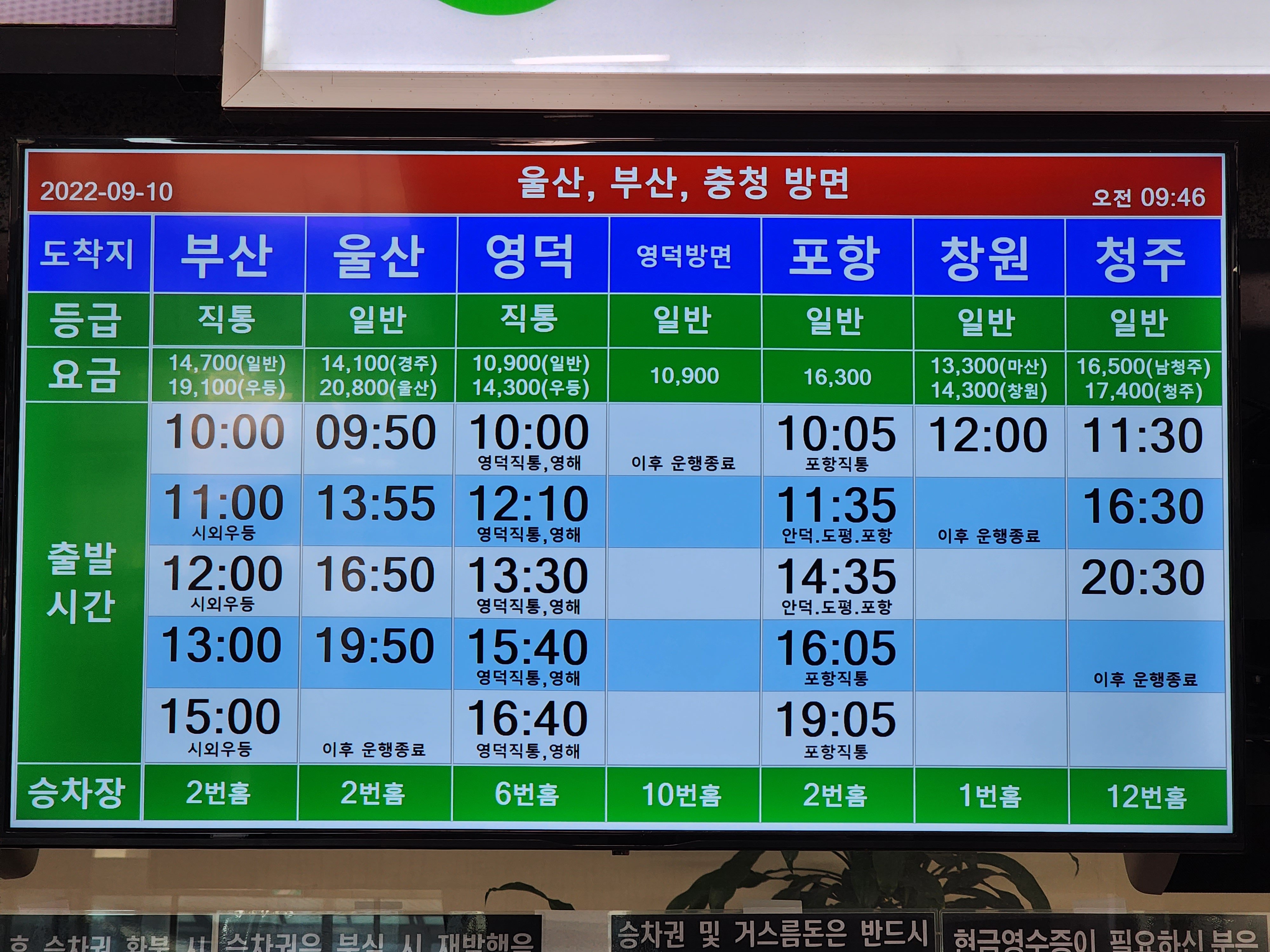 안동 출발 울산, 부산, 충청 방면