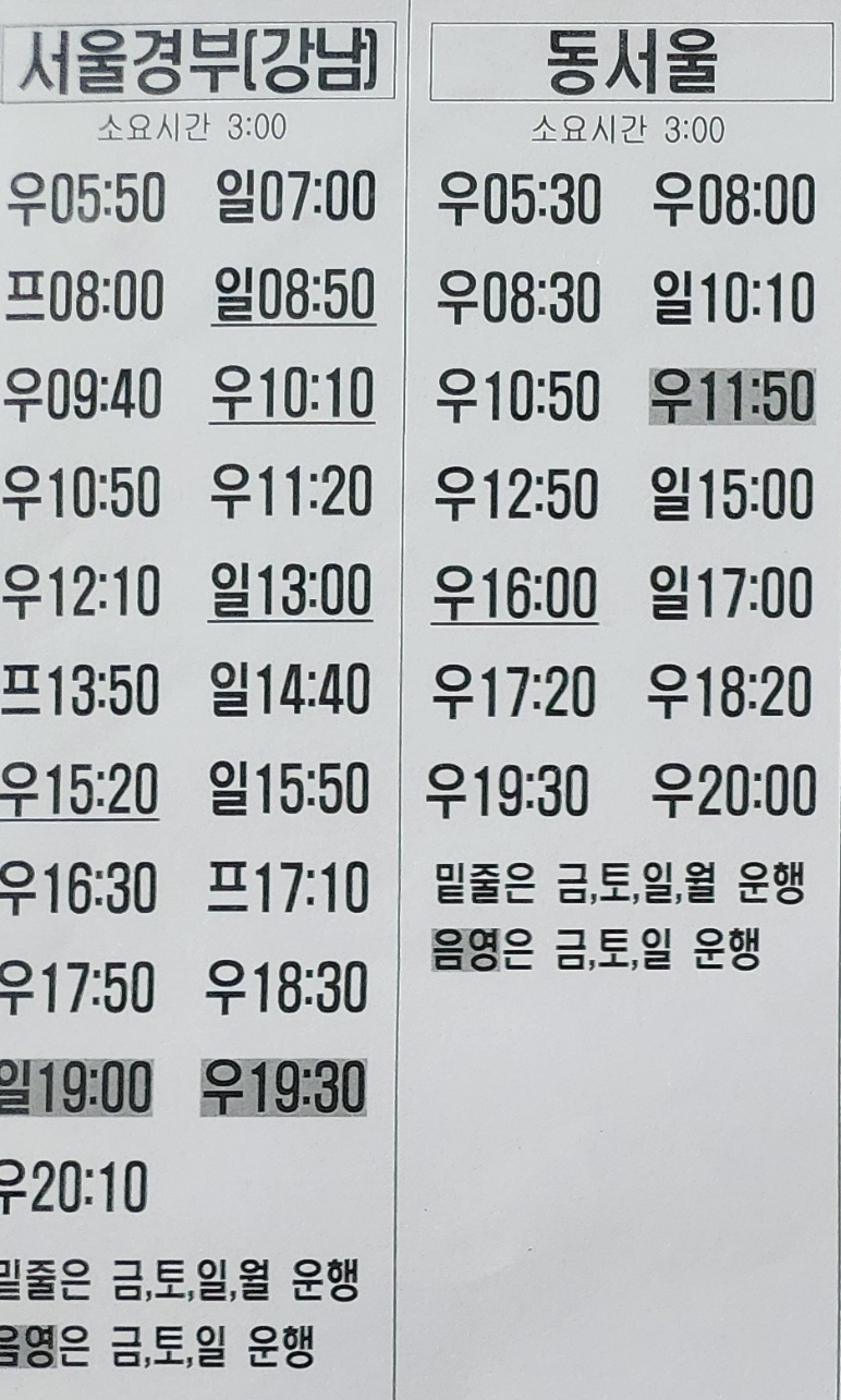 안동출발 서울 경부 강남, 동서울 방면