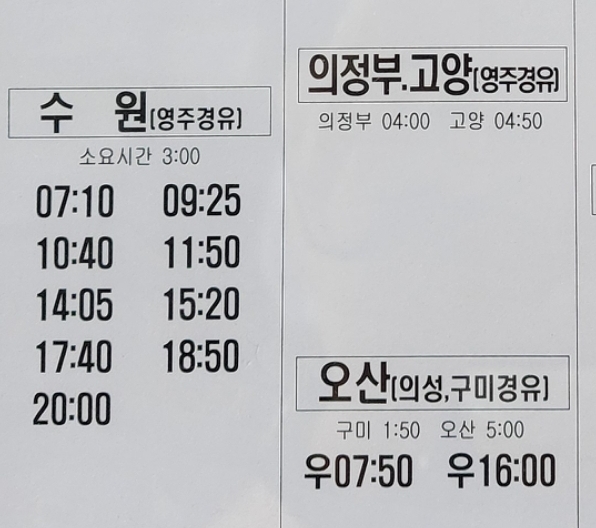 안동 출발. 수원, 의정부, 고양, 오산 방면