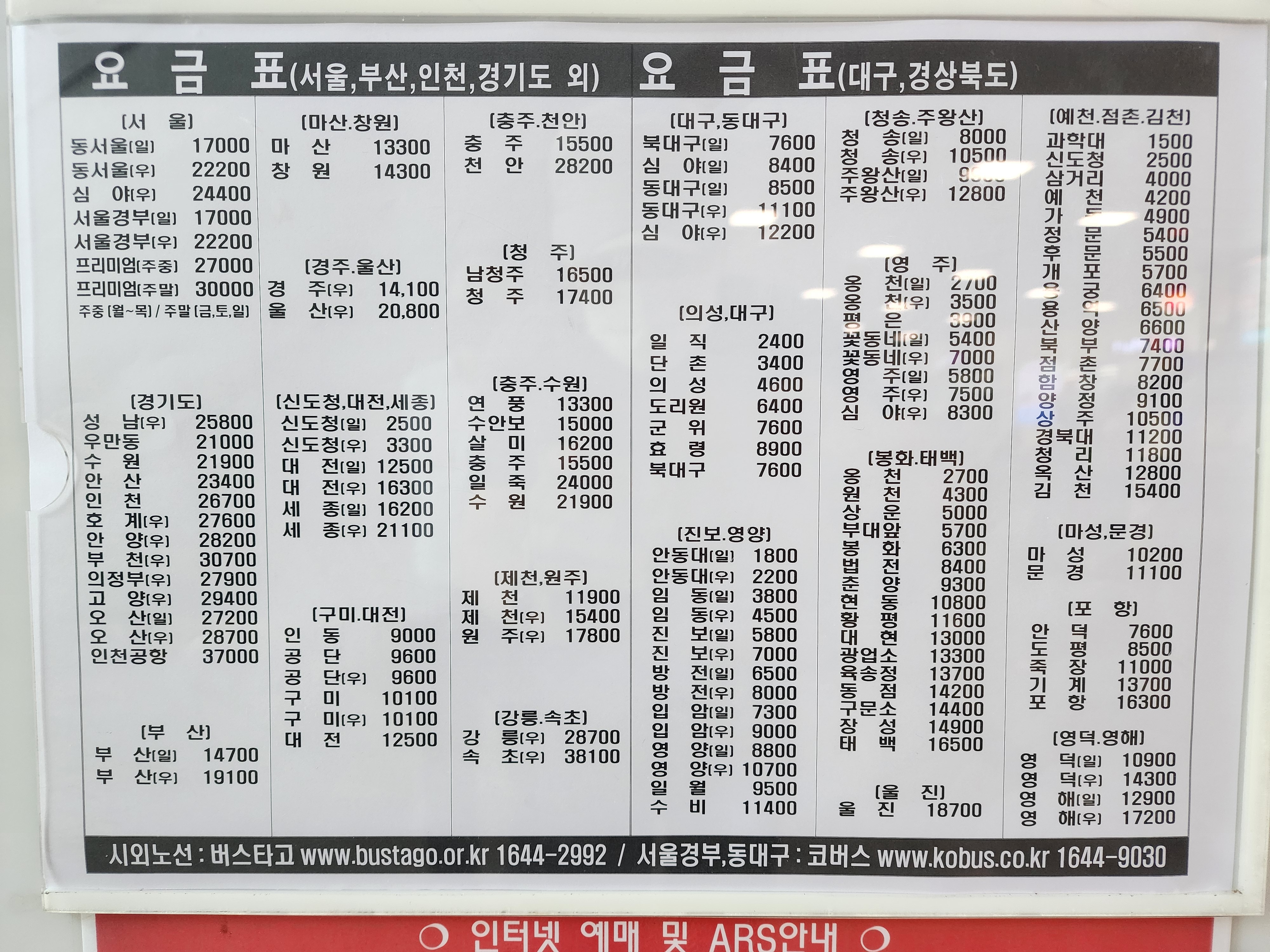안동시외버스터미널 요금표