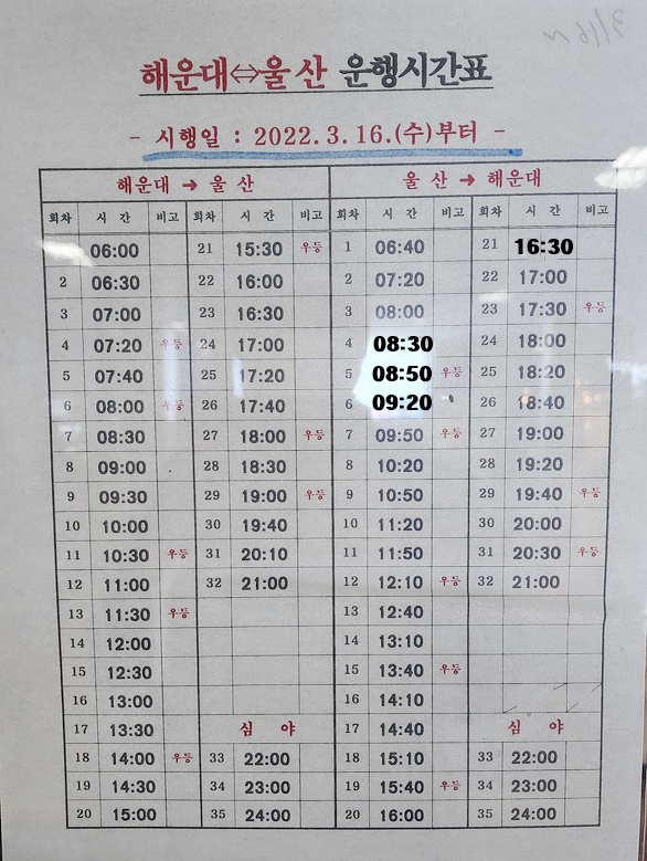 울산 출발 구미, 점촌, 충주, 동해, 강릉 방면.