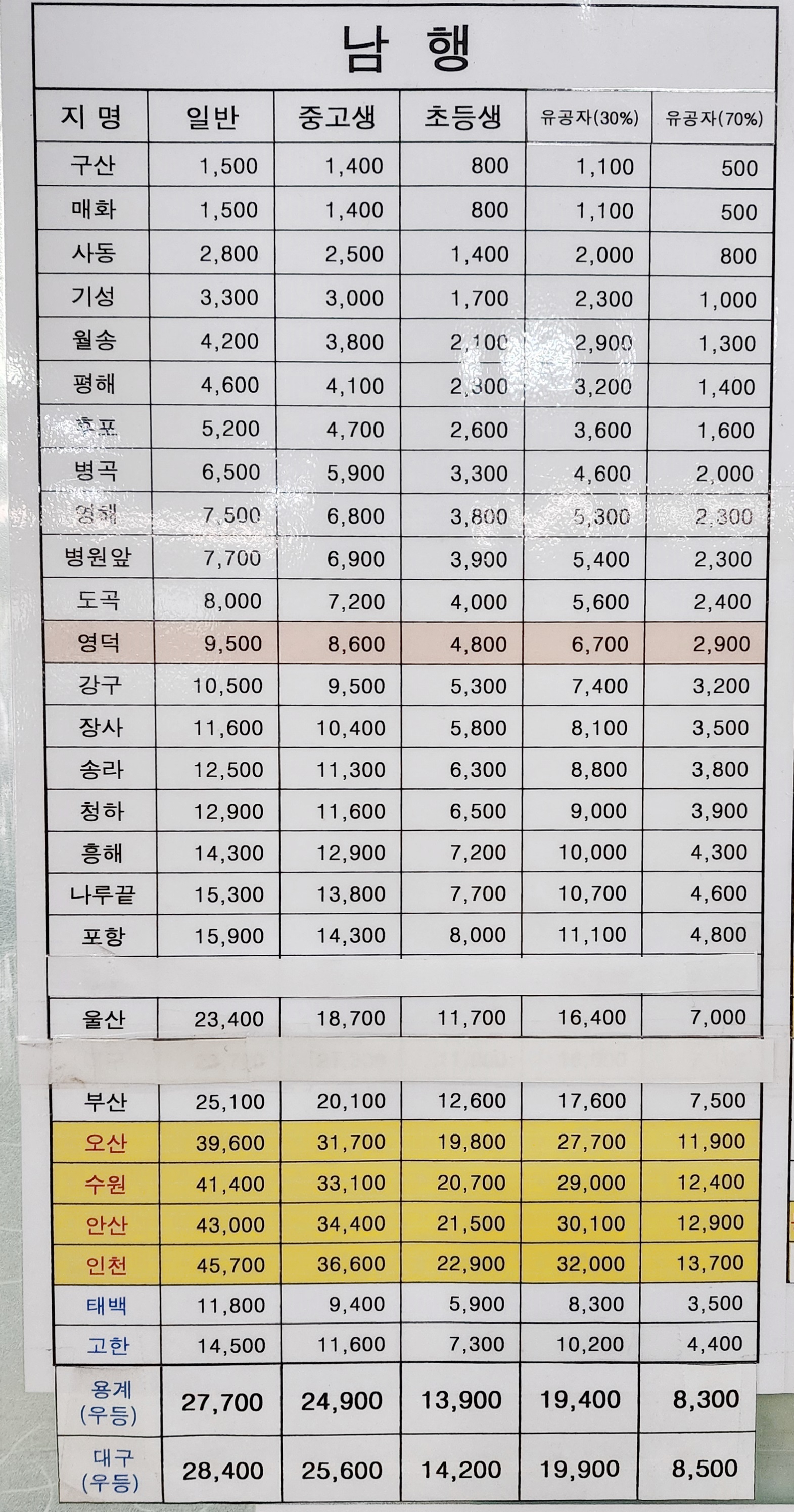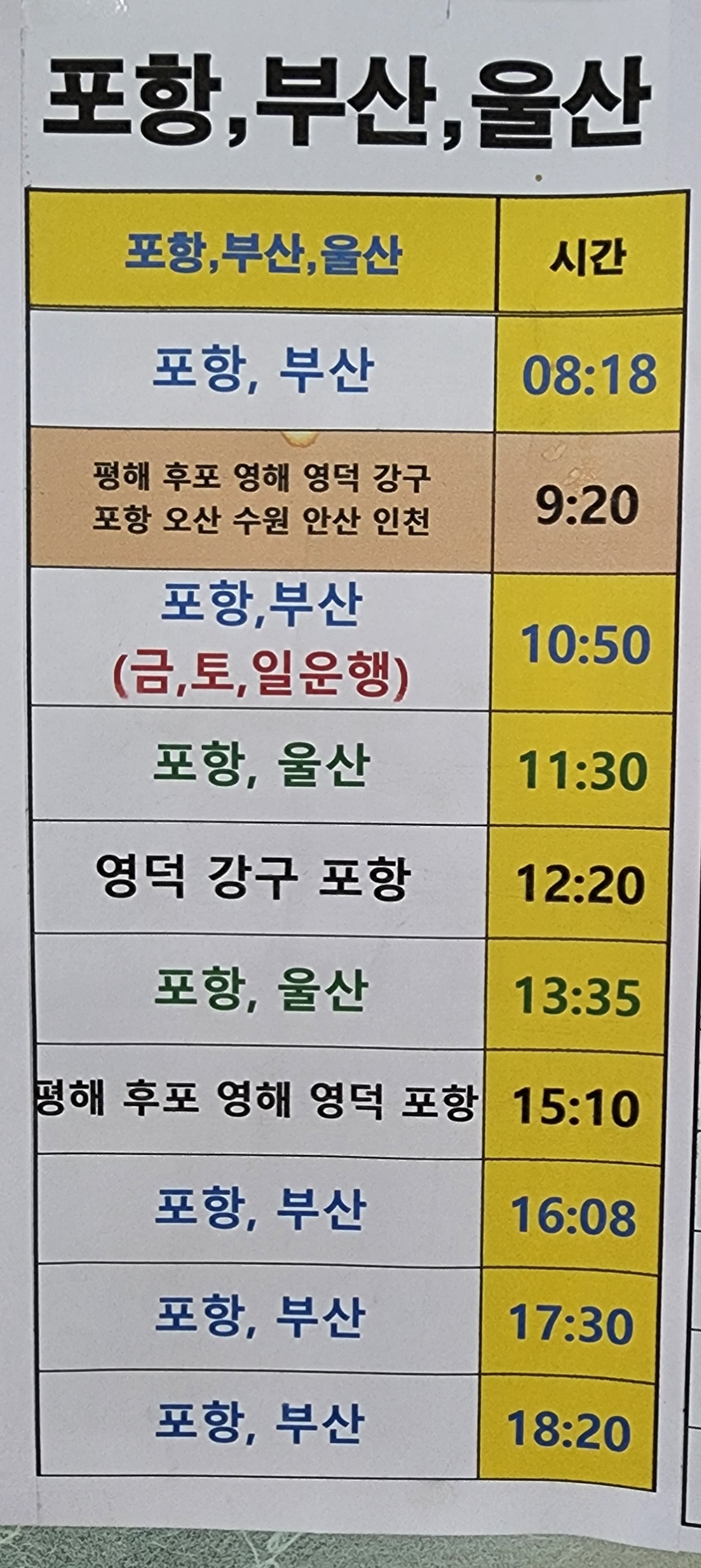 울진 출발 포항, ,영덕, 강구, 평해, 후포, 영해, 부산, 울산 방면.
