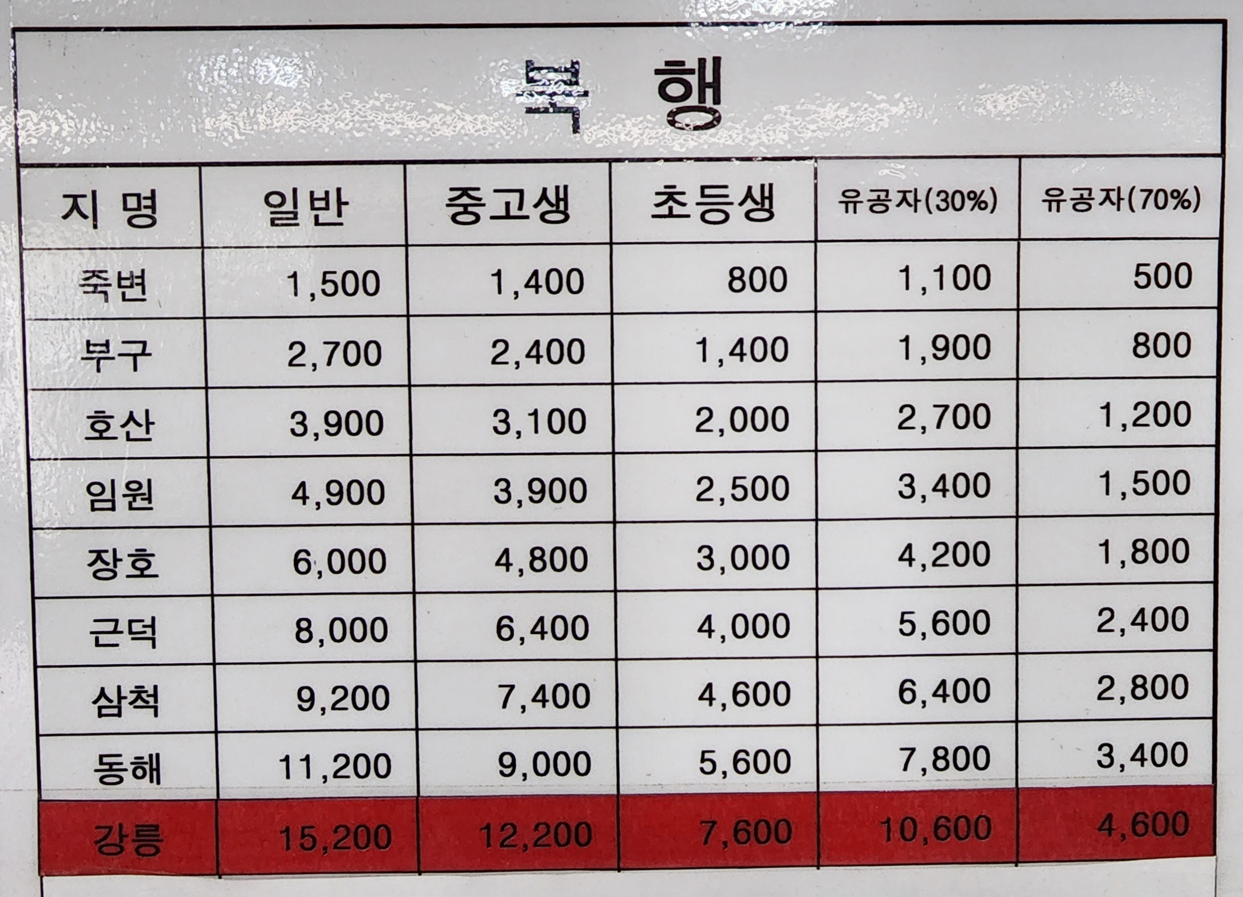 울진 출발 강릉, 삼척, 동해, 속초, 거진 방면.
