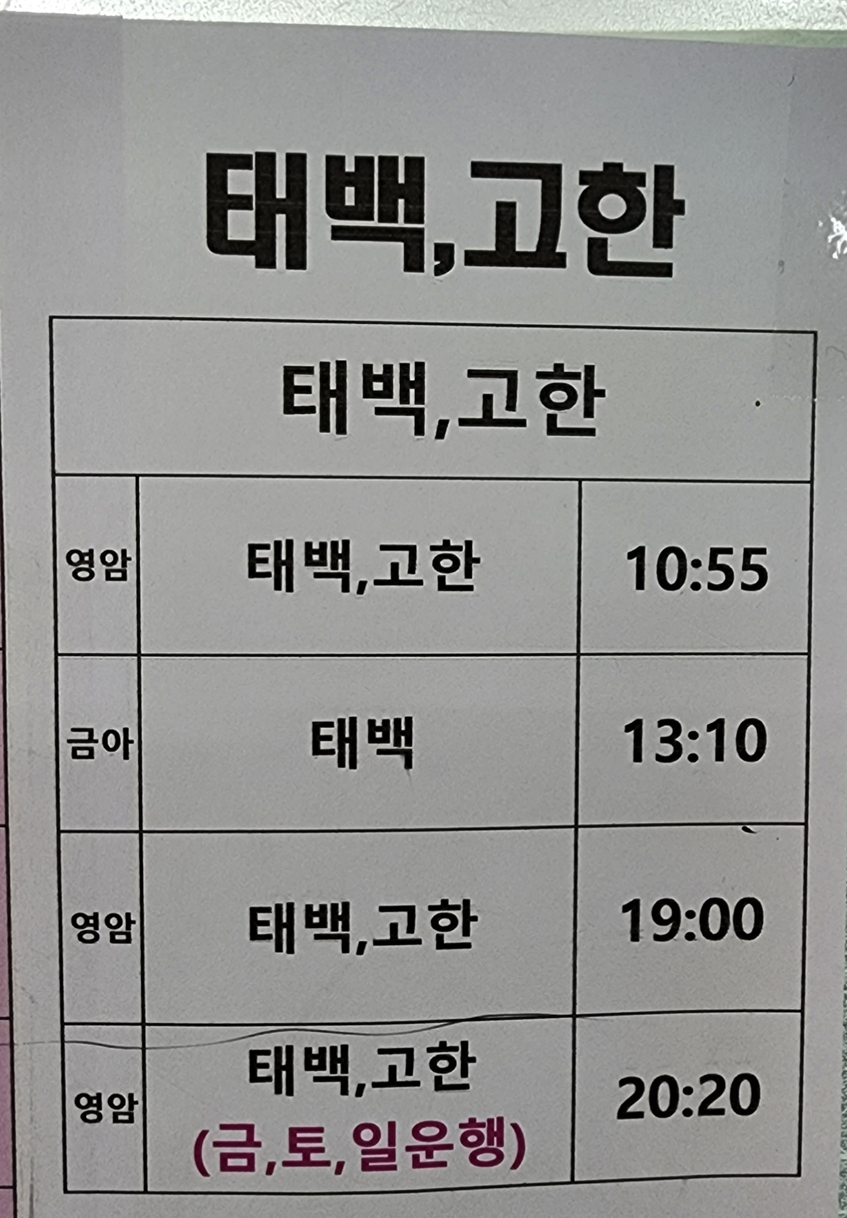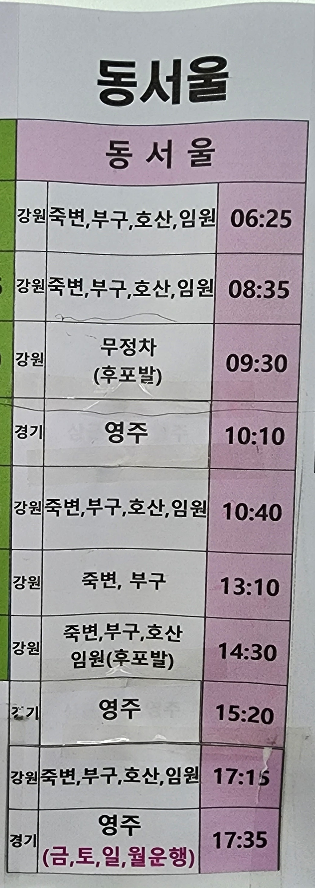 울진 출발 동서울, 죽변, 부구, 호산, 임원, 영주 방면.