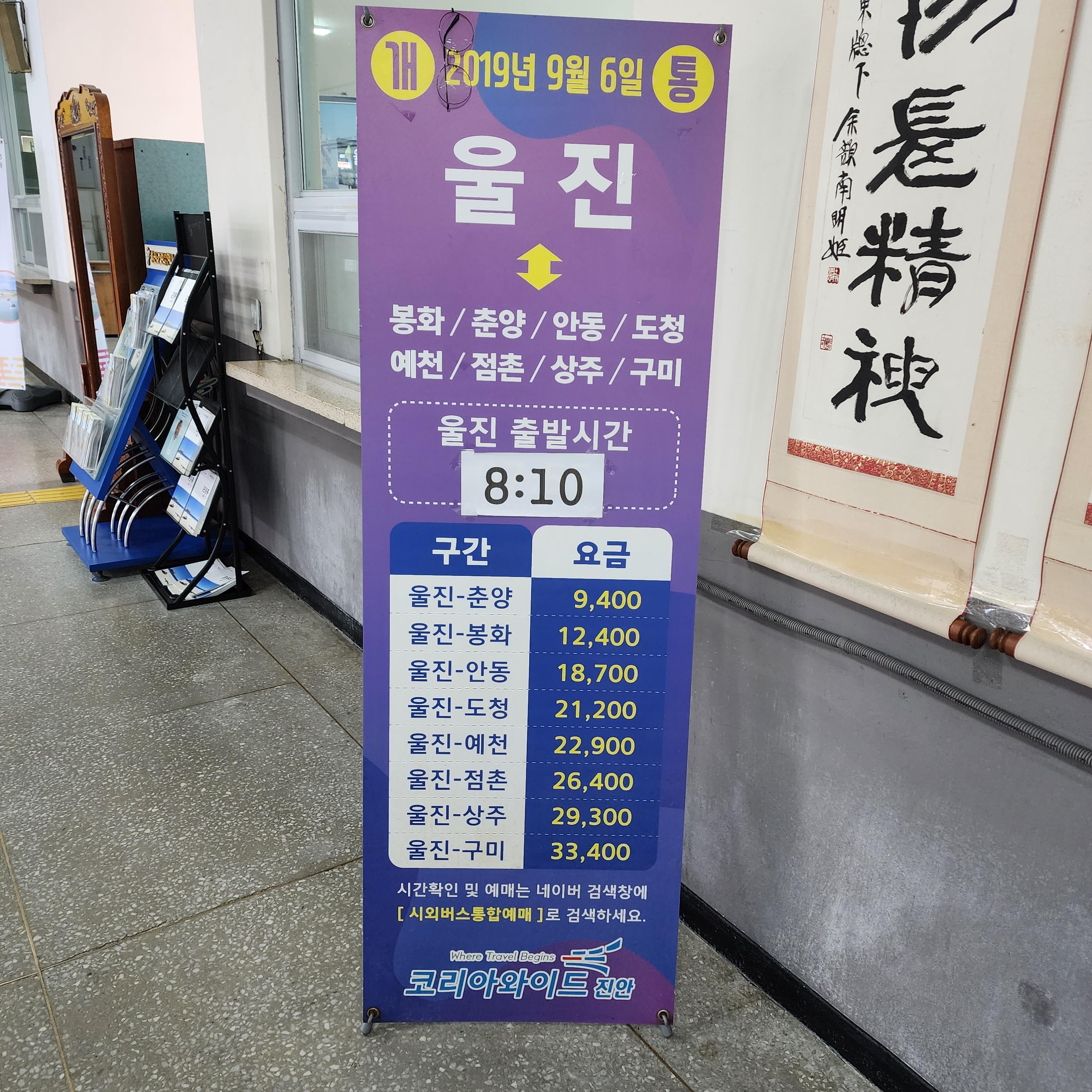 울진 출발 동서울, 죽변, 부구, 호산, 임원, 영주 방면.