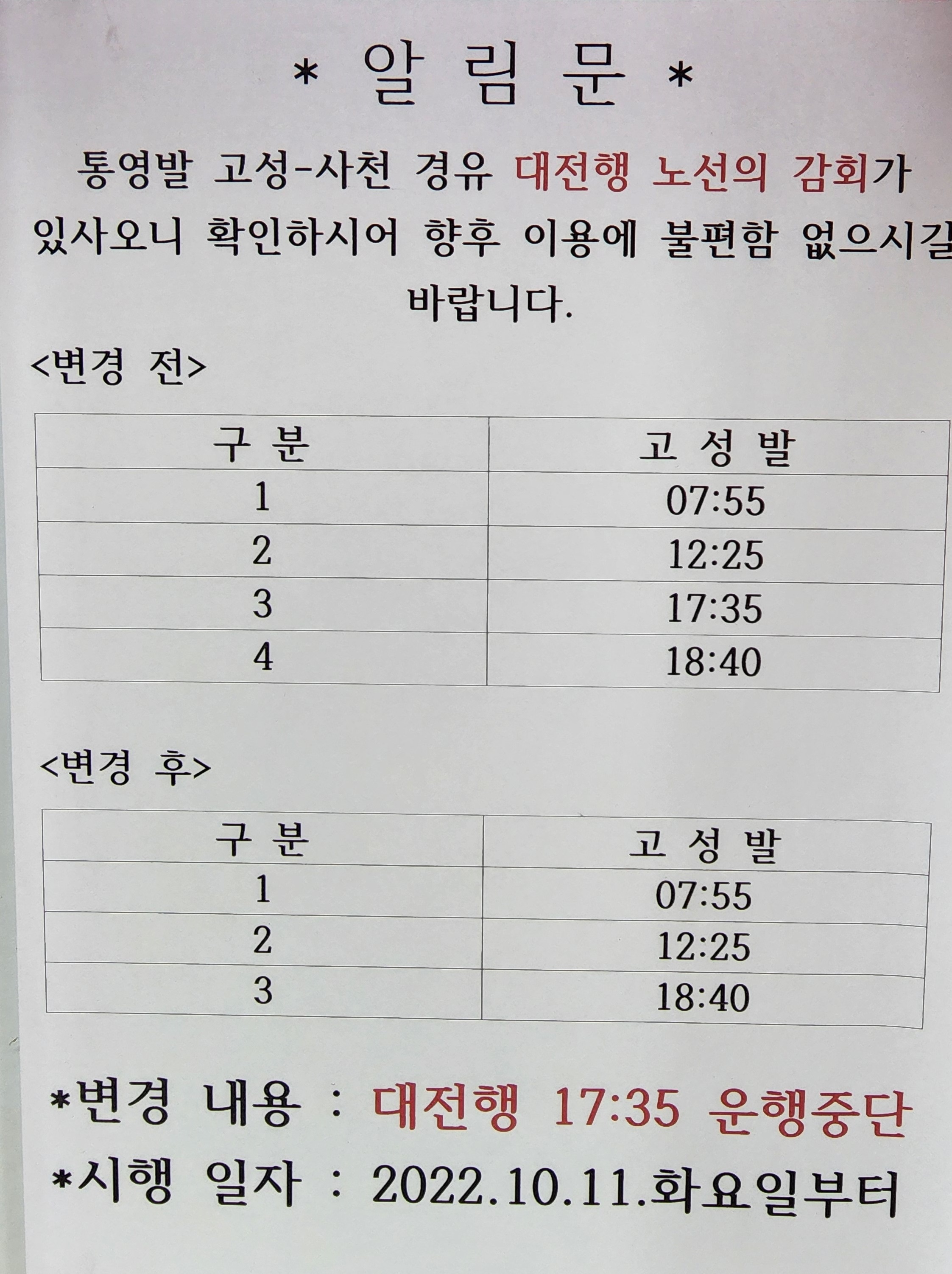 2022년 10월 11일 부터 대전행 17:35 중단.