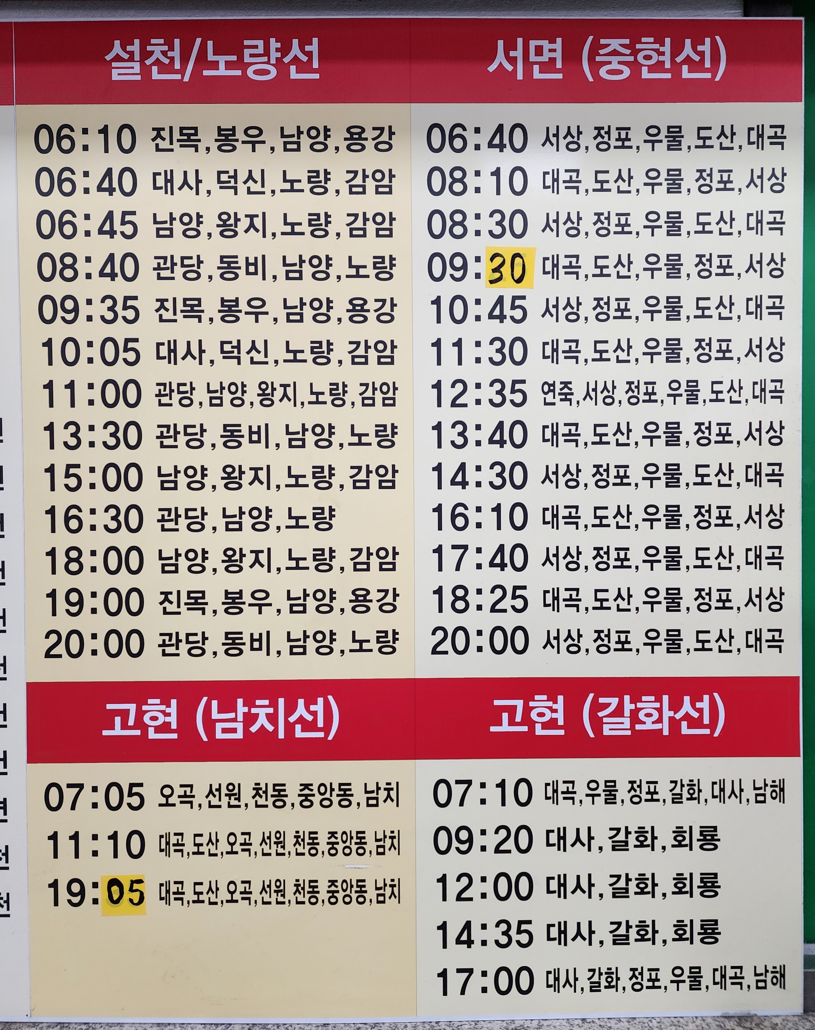남해 출발 설천, 노량, 서면, 중현, 고현, 남치, 갈화 방면.