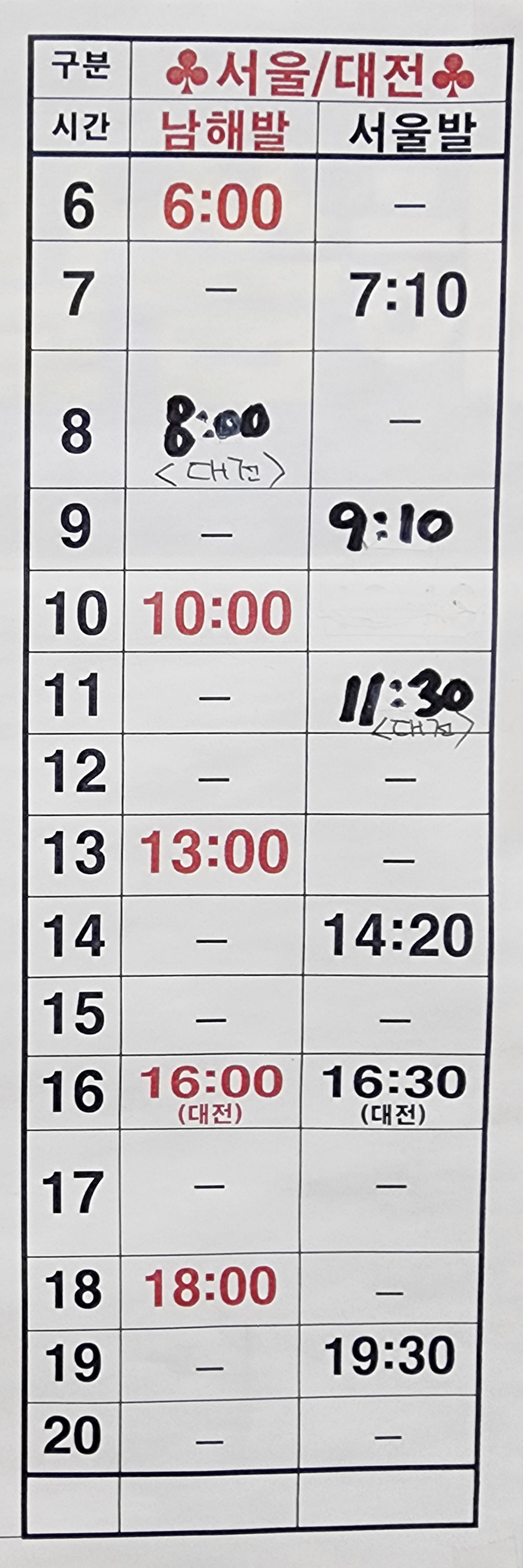 남해 출발 서울, 대전 방면.