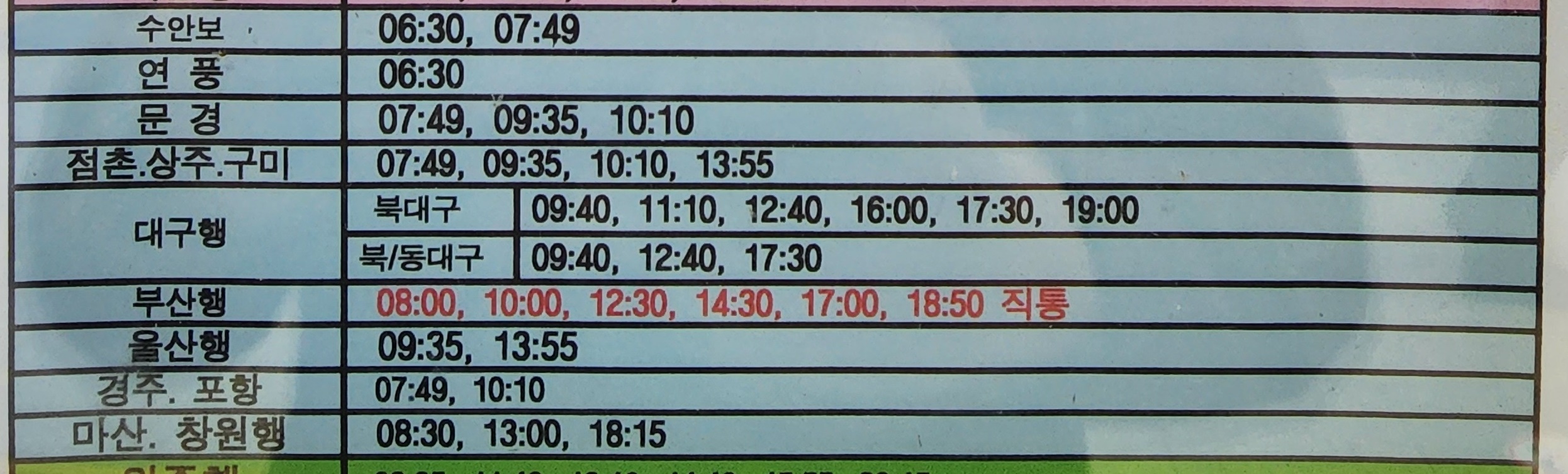 충주 출발 원주, 강릉, 광주, 유성, 전주 방면.