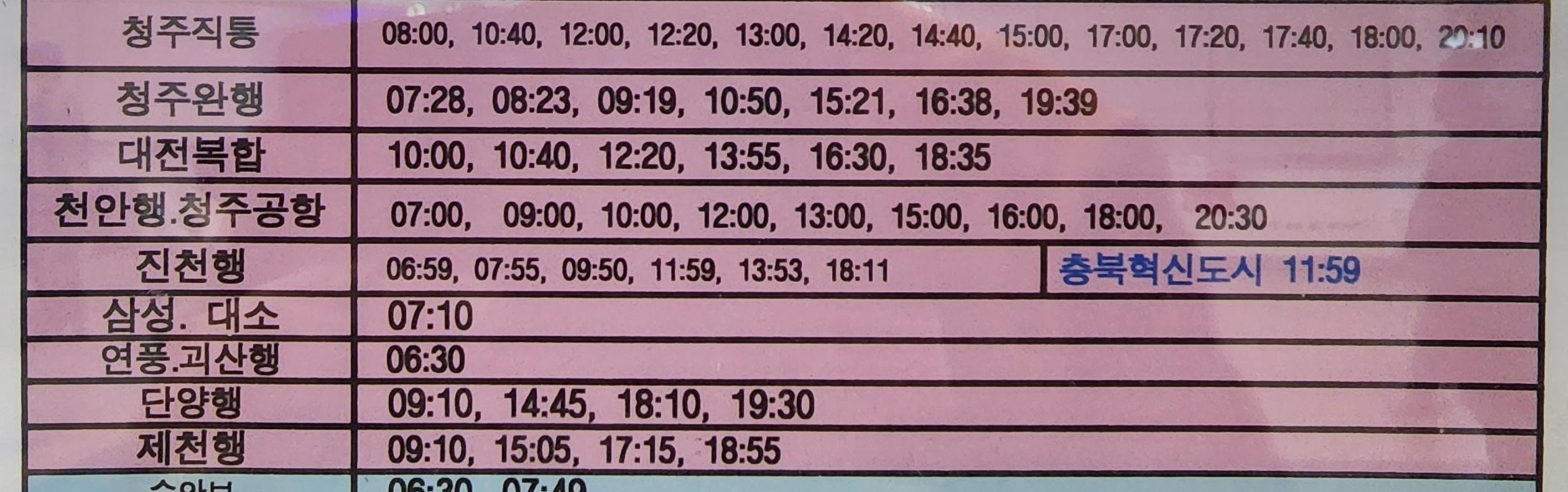 충주 출발 청주, 대전복합, 천안, 청주공항, 진천, 삼성, 대소, 연풍, 괴산, 단양, 제천 방면.