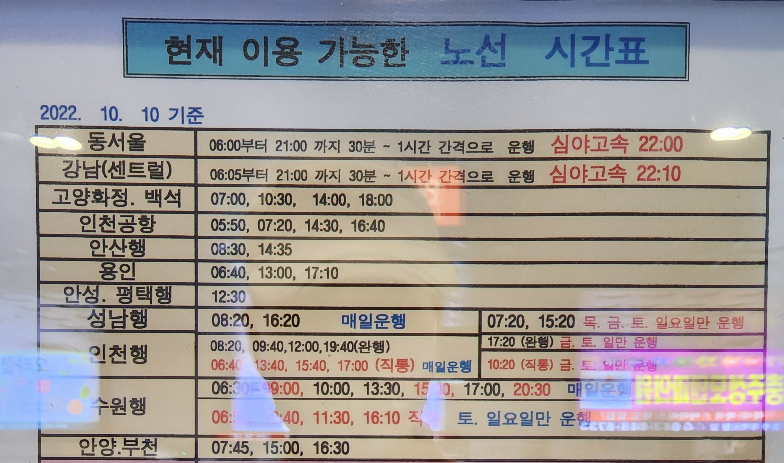 2022년 10월 10일 기준 현재 이용 가능한 노선 시간표