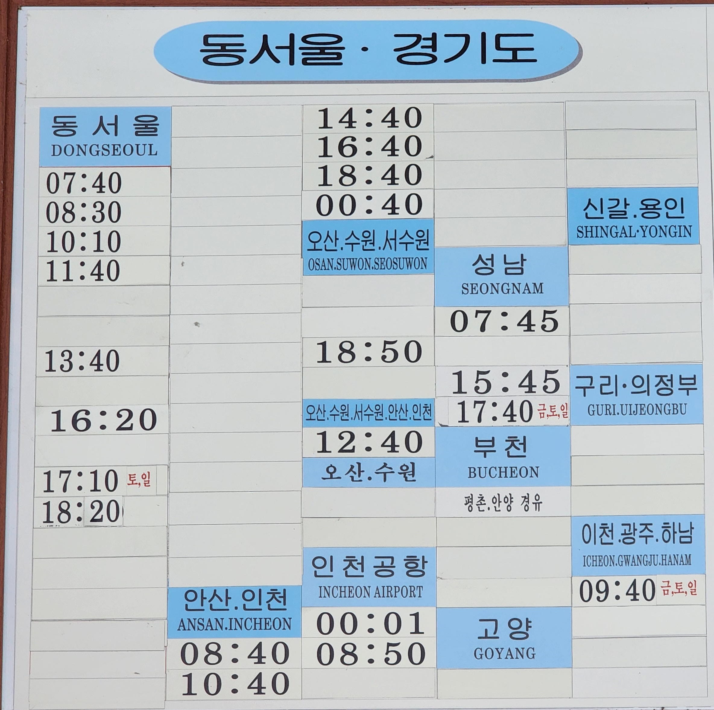 경주 출발 동서울, 안산, 인천, 오산, 수원, 서수원, 인천공항, 성남, 이천, 광주, 하남 방면.