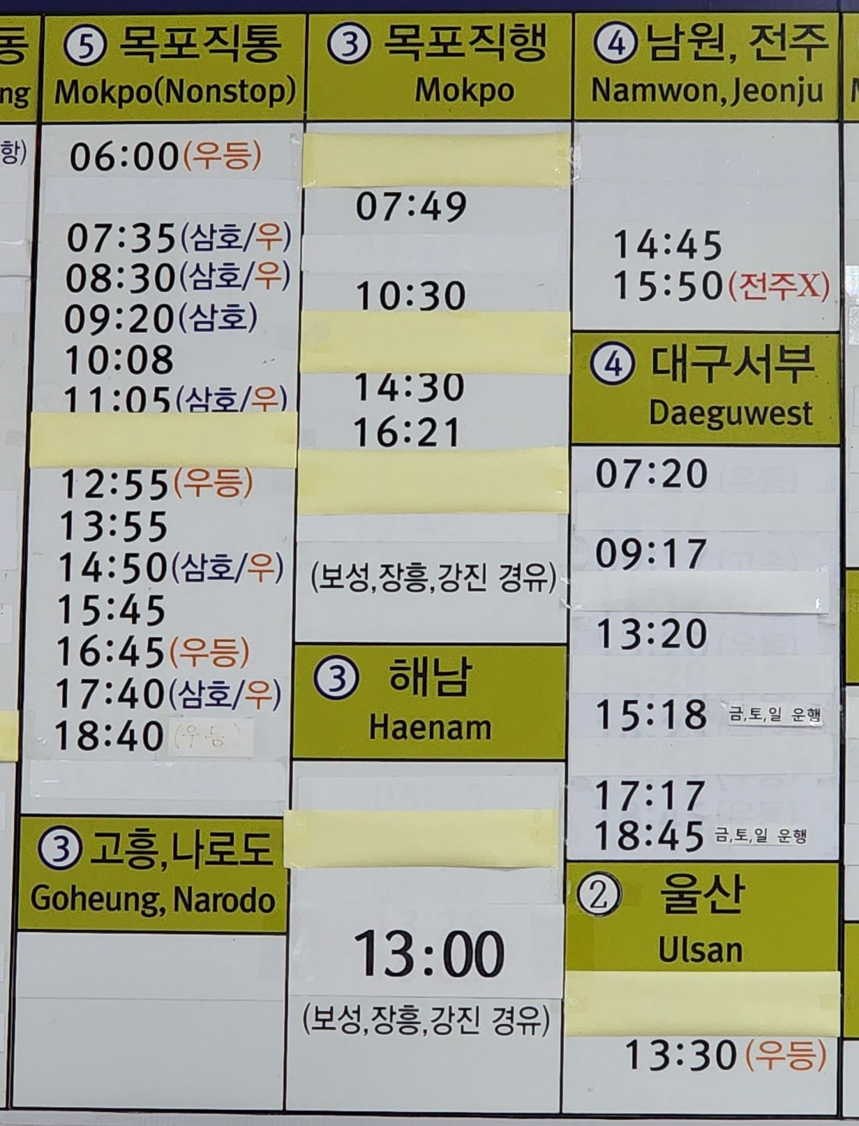 여수 출발 목포, 남원, 전주, 대구 서부, 고흥, 나로도, 해남, 울산 방면.