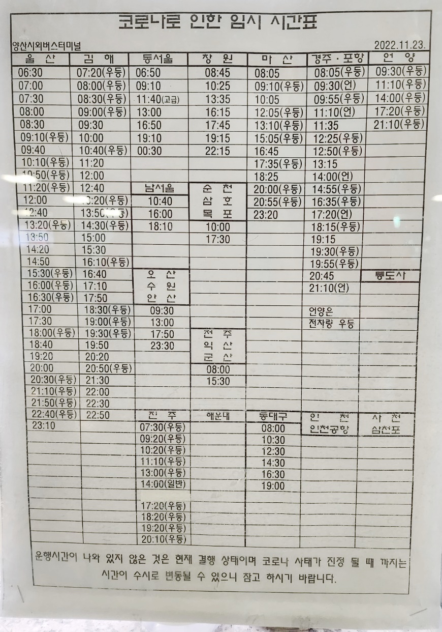 양산 출발 울산, 김해, 동서울, 남서울, 오산, 수원, 안산, 진주, 창원, 순천, 삼호, 목포, 전주, 익사, 군산, 마산, 동대구, 경주, 포항, 언양 방면.