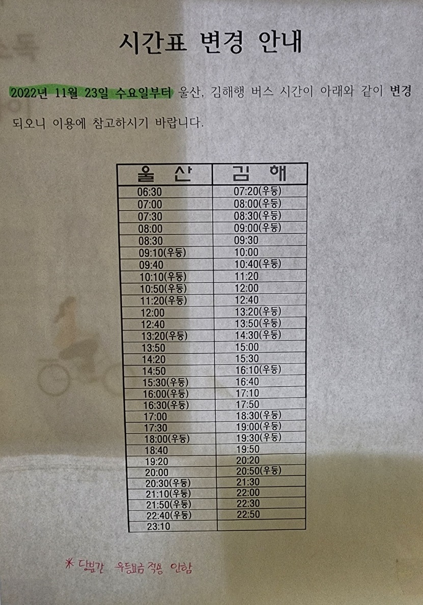 양산 출발 울산, 김해, 동서울, 남서울, 오산, 수원, 안산, 진주, 창원, 순천, 삼호, 목포, 전주, 익사, 군산, 마산, 동대구, 경주, 포항, 언양 방면.