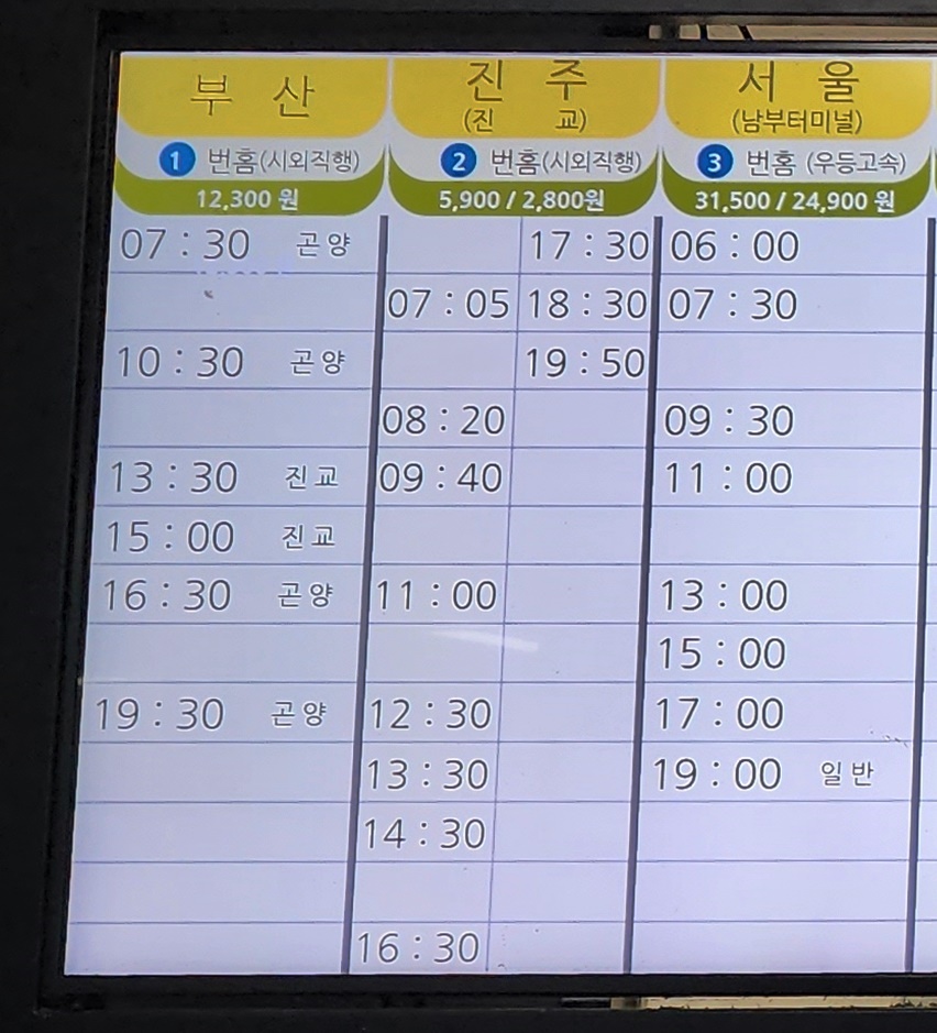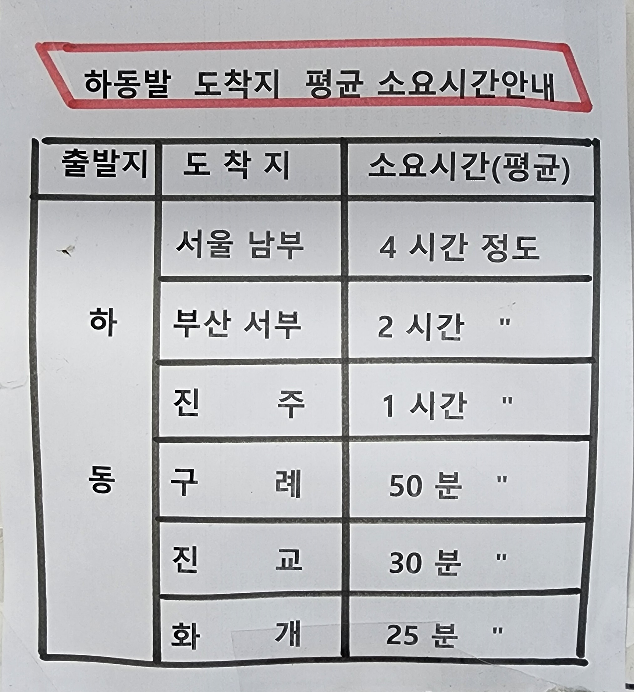 하동 출발 부산, 진주, 서울 남부터미널 방면.