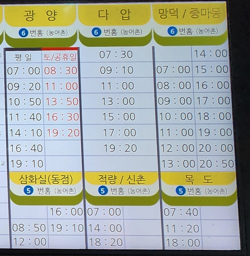 하동 출발 광양, 다압, 망덕, 중마동, 삼화실 동점, 적량, 신촌, 목도 방면.